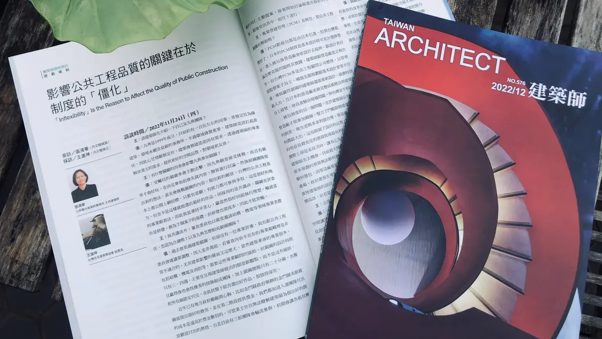 返回 台灣建築學會會刊 | No.109 張清華談影響公共工程品質的關鍵制度 2023-02-17 公共工程競圖是九典常駐業務之一,因為相信公共建設對於社會大眾的影響力大,我們勇於接受挑戰,亦作為內部激盪與快速研發的契機。 2022年,九典在幾個競圖中失利,除了繼續在建築設計中檢視摸索,也同時思考制度、機制之間的關聯。很高興看到本期《台灣建築學會會刊》-攤開競圖制度的遊戲規則,全冊針對競圖議題深度探討,感謝客座主編王進坤邀請張清華建築師受訪「影響公共工程品質的關鍵在於制度的僵化」一文,分享屬於我們的立場觀點,沒有對錯,只有更多交流。