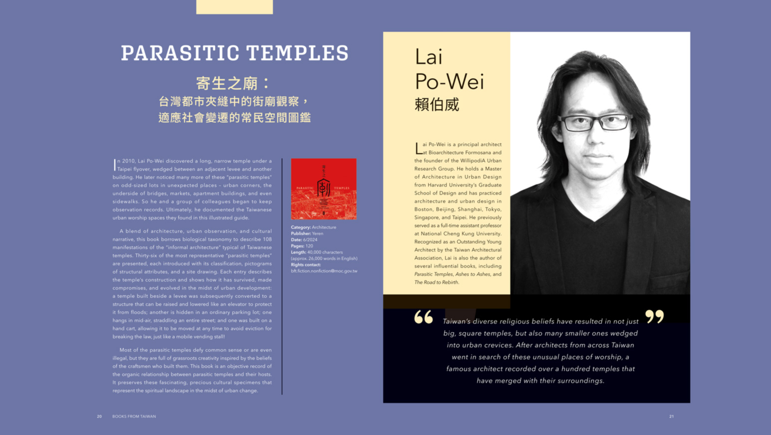 返回 文化部計畫 | 賴柏威著作《寄生之廟》榮獲文化部推廣 2025-12-04 九典主持建築師賴伯威著作《寄生之廟》獲選文化部「Books From Taiwan」推廣計畫!建築師以獨特視角,探討台灣都市夾縫中的街廟如何適應社會變遷下的常民空間。 文化部的「Books From Taiwan」計畫,挑選具國際版權潛力與在地特色的作品,讓台灣好書有機會被國外出版商看見、翻譯、發行。這次入選的,也有林子平教授的著作《溫度的正義》,以及探索台灣城市文化的《大稻埕滋味》、紀錄傳統市場文化的《台灣百年市場》等書籍。 這次入選,期待讓更多人看見台灣跨文化、跨領域的書籍,讓國際讀者看見不同的台灣樣貌。 深入閲讀: BOOKS FROM TAIWAN