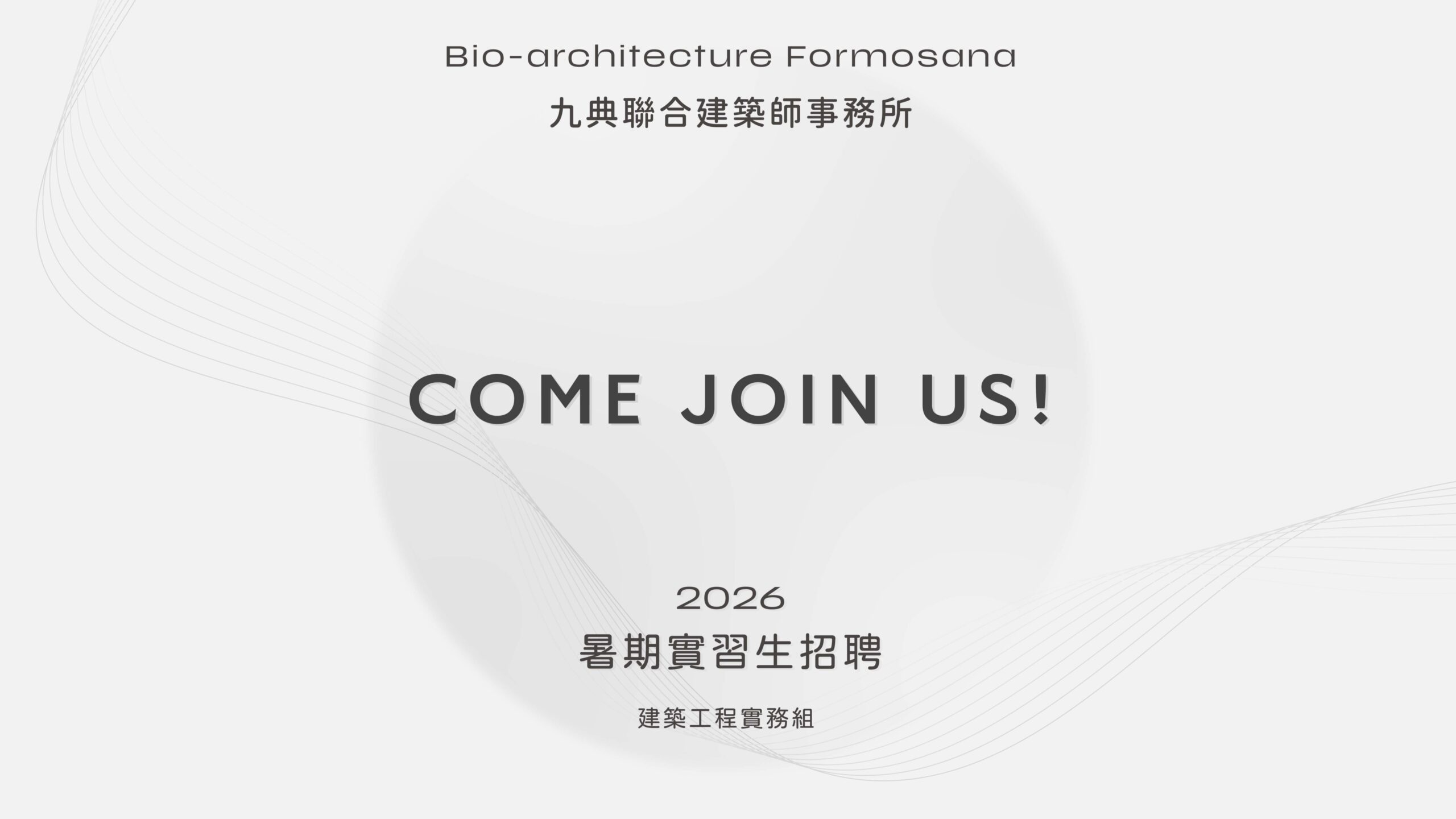 返回 招聘 | 2026 暑期實習生(建築工程實務組) 2026-04-20 工程是建築歷程中極重要一環,九典事務所除了建築設計工作外,更涵蓋許多監造工程任務,才得以完成每一個案子。 九典徵求傑出學生加入我們的團隊。邀請就讀建築、室內設計、土木營管、機電與空調等相關專業本科大三學生以上、大五應屆畢業生或研究生,提供爲期3個月以上的全職實習機會(若經評估,亦有長期實習的機會)。 「建築工程實務組」實習生將於九典工務所進行實習,工作內容包含工程過程的品管及監督任務,並整合工程與設計界面。歡迎你一起加入! 請將您的簡歷(PDF,10MB)寄至 arch@bioarch.com.tw,Mail主旨請務必註明「暑期實習生申請(建築工程實務)」,若有特殊針對地區意向,歡迎於申請時提出。 // 收件截止日期 // 2026/05/08 實習內容學習進行中的工程品管監督流程,參與監造進度會議與紀錄協助BIM工程界面整合(視工程特性)了解工程履約管理的執行方式了解職業安全執行工作重點 實習名額 台北2名 (事務所 – 工程技術組) 台中2名 (工務所) 台南1名 (工務所) #九點來上班,來九典上班 了解更多九典作品 了解更多九典大家庭 了解工務所實習生工作內容 (2023 工務所實習心得影片)