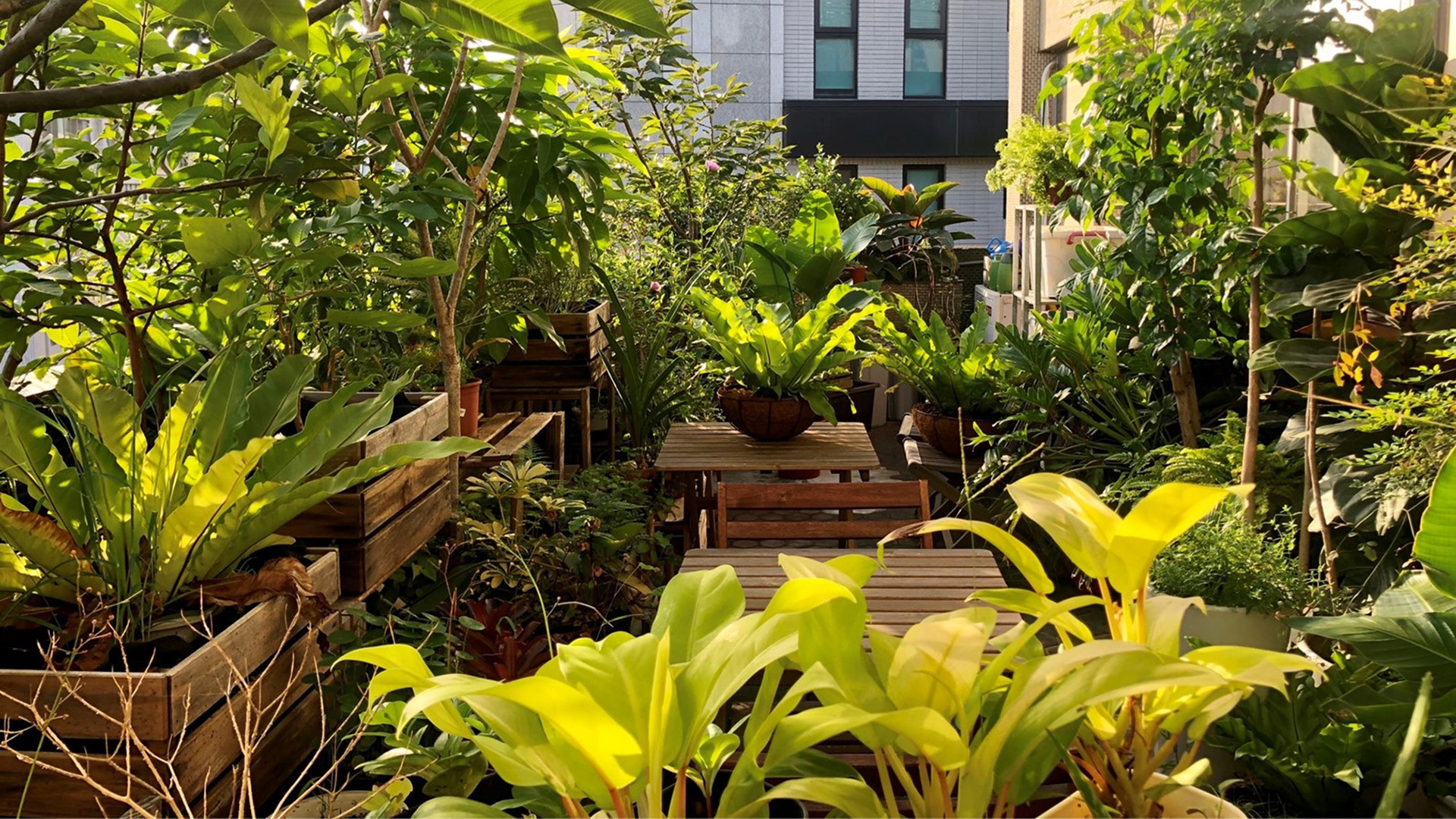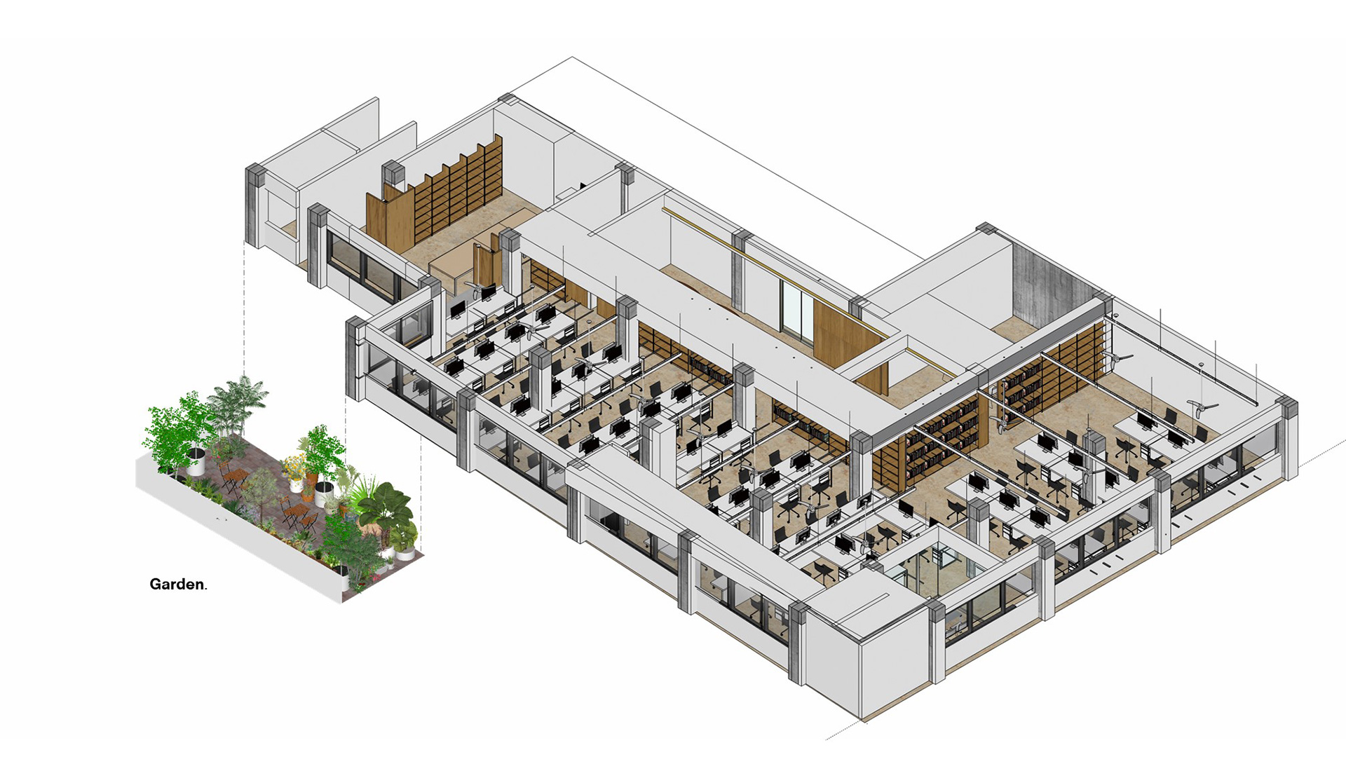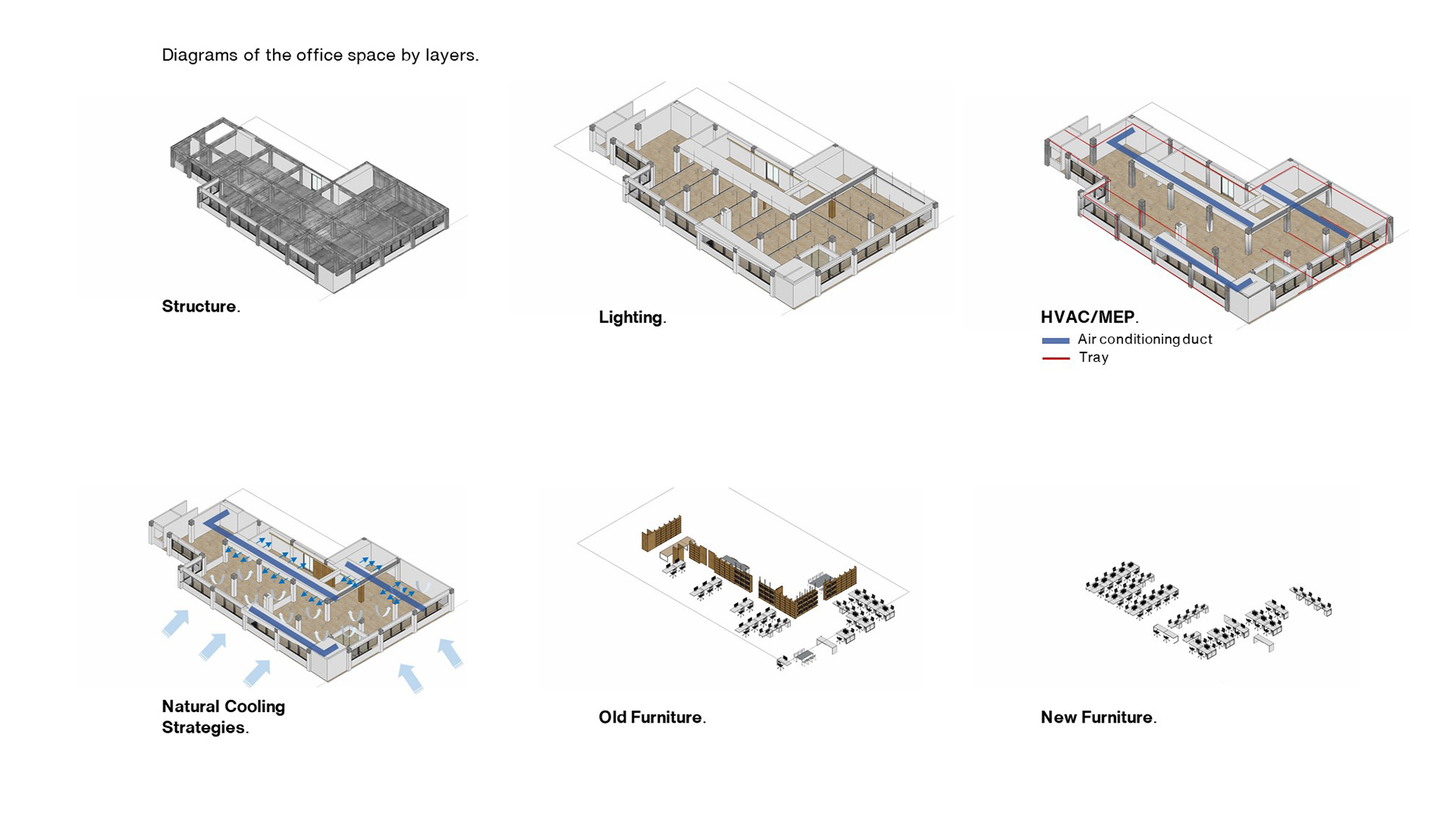 The space configuration reduced the walkway area and screen to separate the public and private areas, allowing the use of space to enhance the interaction between colleagues. The terrace was transformed into a green space where various plants are grown, becoming a place for employees to find respite during their workday.The office was equipped with the old ceiling fans for energy-saving purposes.