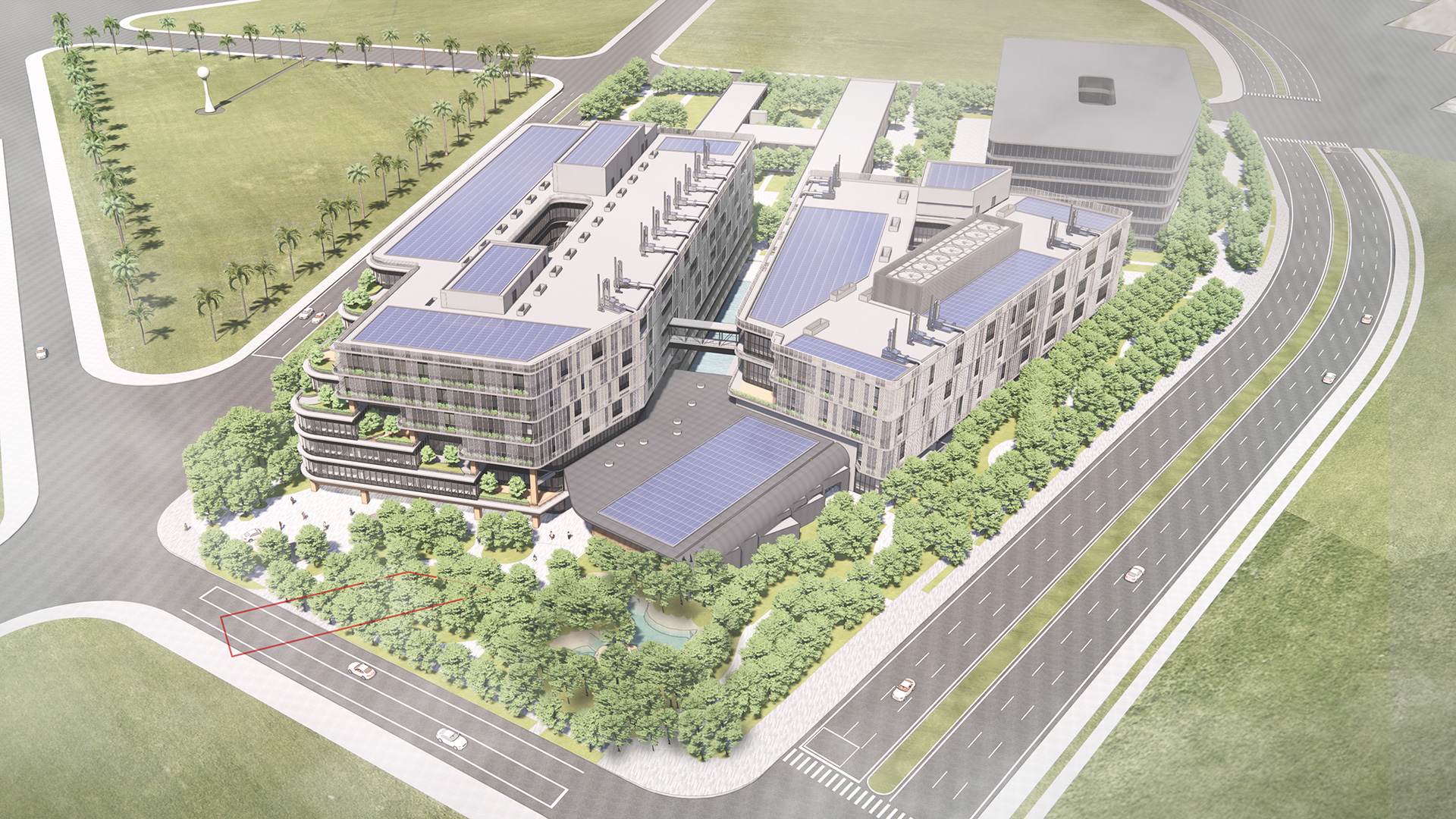 The north, west and south sides of the site are designated as industrial zones, which will be the focus of future development. In this design, the building on the west side is set back to create a plaza showcasing research and welcoming visitors while the south side provides space for leisurely walks and relaxation.