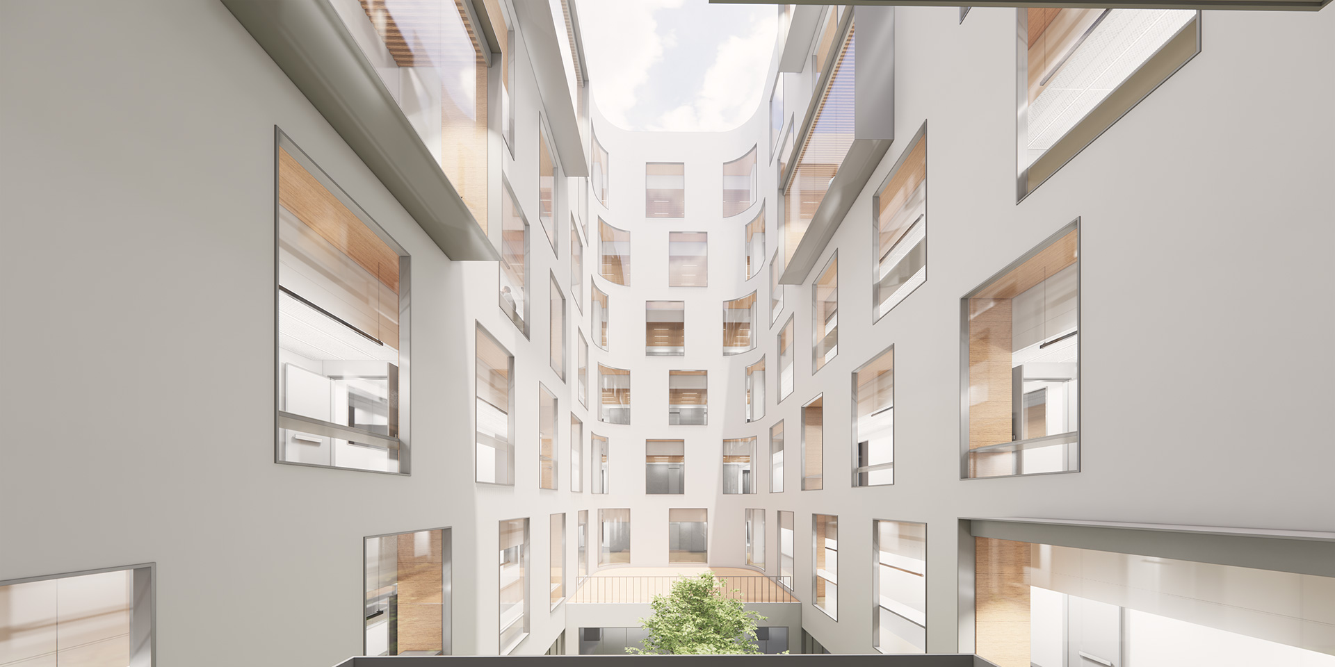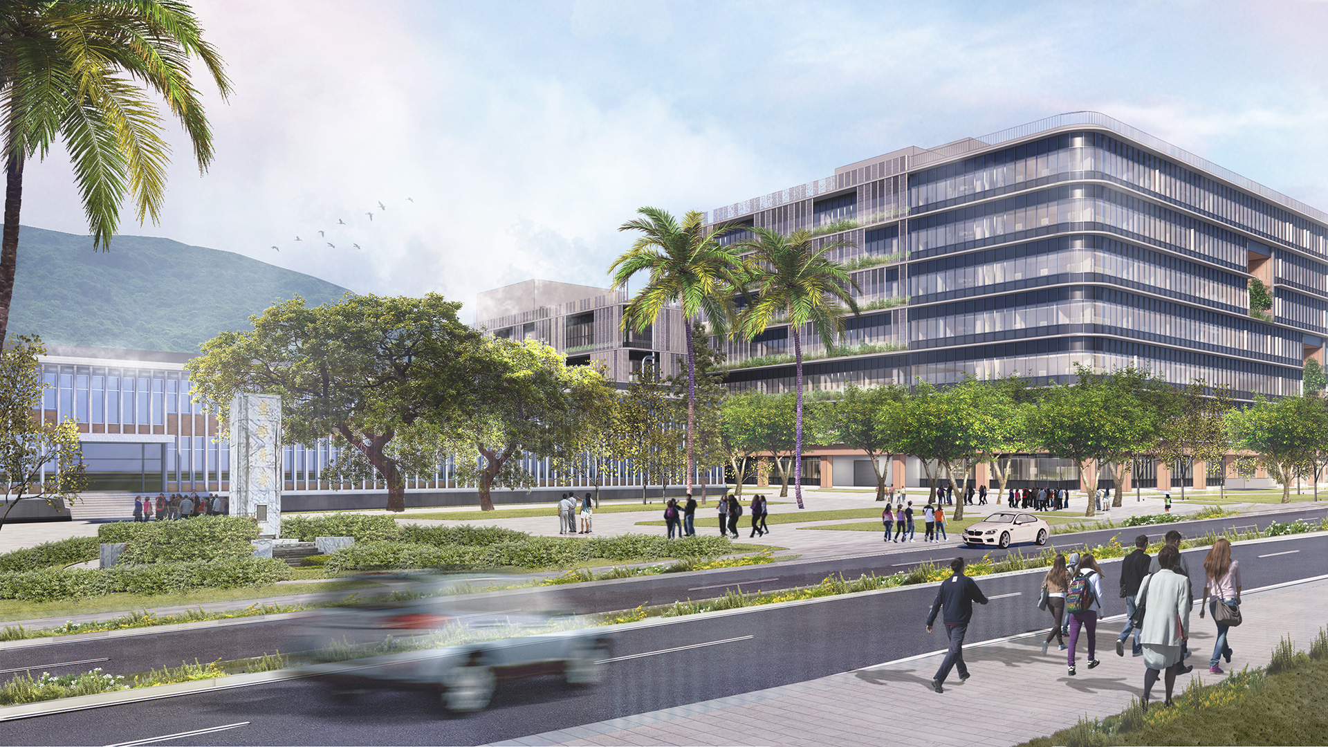 Two towers are arranged along the North-South axis, with a pond in the middle that connects to the historical building. On the north side, the historical plaza is preserved by setting back the building mass. On the northwest side, a colonnaded walkway is provided to ensure pedestrian-friendly access.