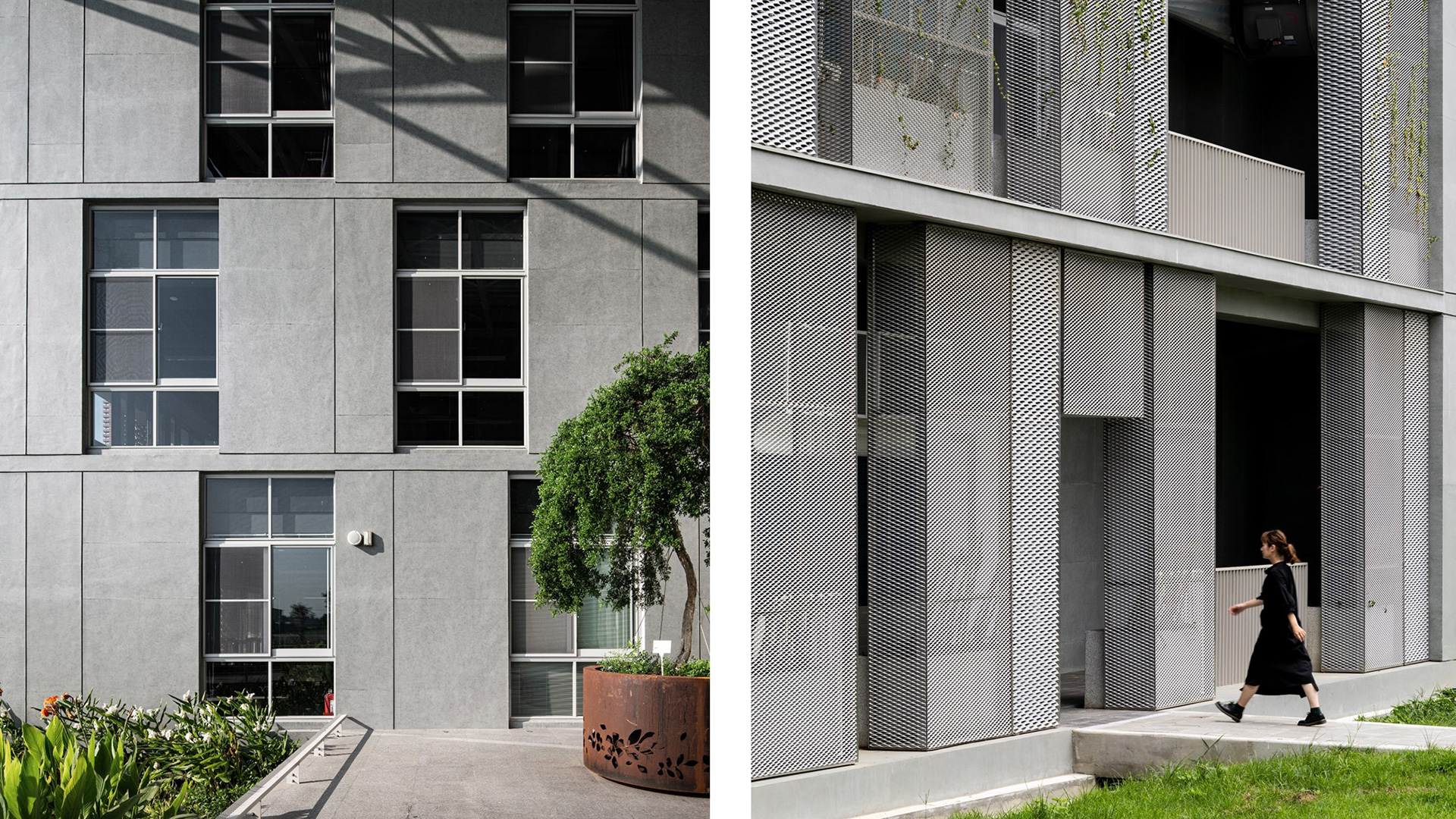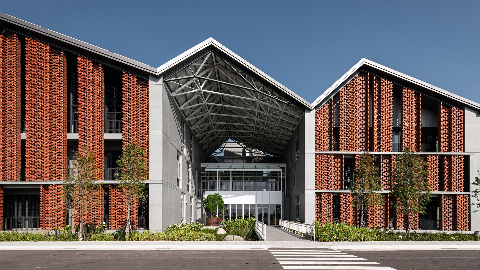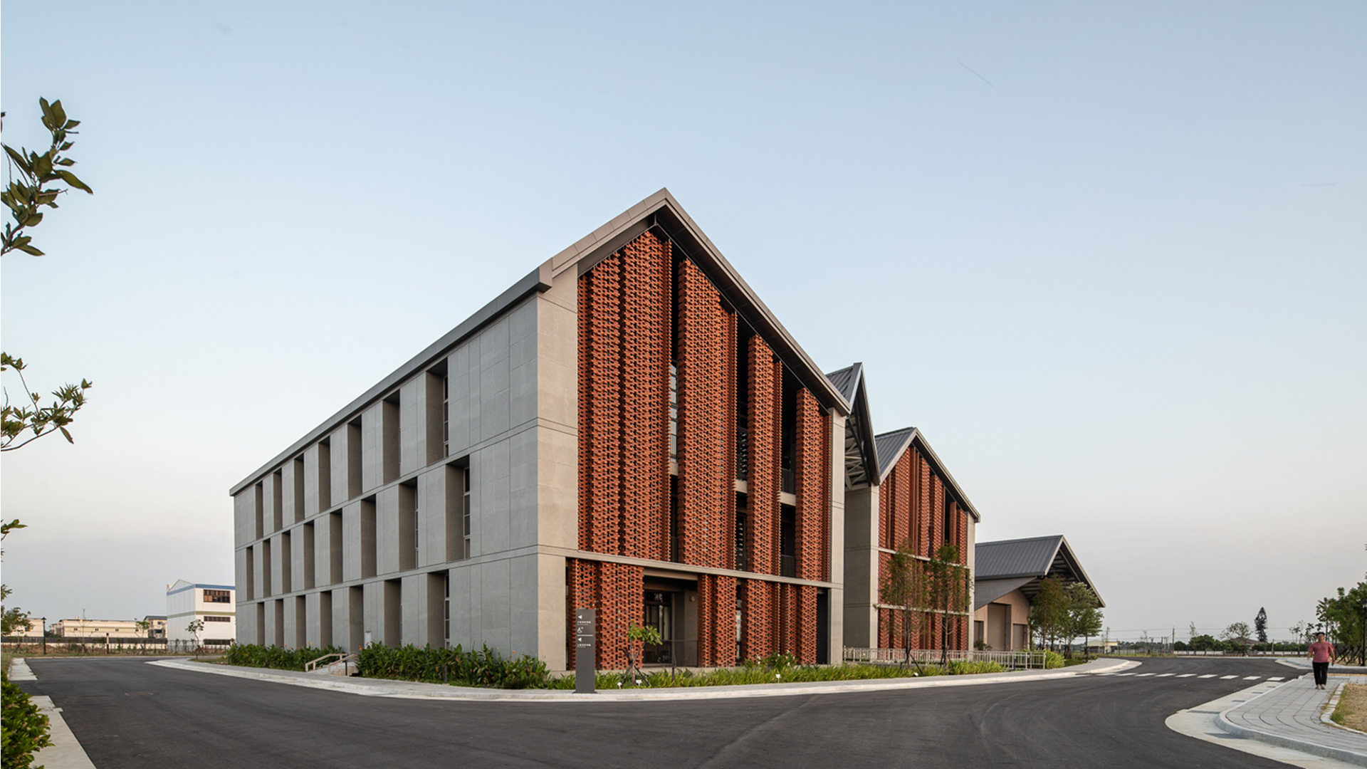 The site will house an institution that fosters agriculture, so the warmth of olden-day villages must not be absent at the cost of avoiding baking summer heat. Redbrick buildings are ubiquitous in Yunlin, so fair-faced bricks have also been brought here. They are not bonded by mortar though but are rather combined with stainless steel piping, rubber pads and steel ring pads that form a layered facade to the west of the building. The brick wall is protection; it blocks the glaring sun while filtering in just the right amount of light and wind to cast mesmerizing patterns inside. The brick wall is also commitment; a commitment to never forget one’s roots despite the inflow of new things, and to appreciate that farm chores are as heavy, rough and modest as this material. However, agricultural technology of the future will become more and more versatile as technology advances, just like how this wall appears heavy and is in fact airy. It is heavy in its physical mass and light in its mortar-free dry-laid technique; it can be dismantled and reassembled anytime to start a new life on another site, over and over again.