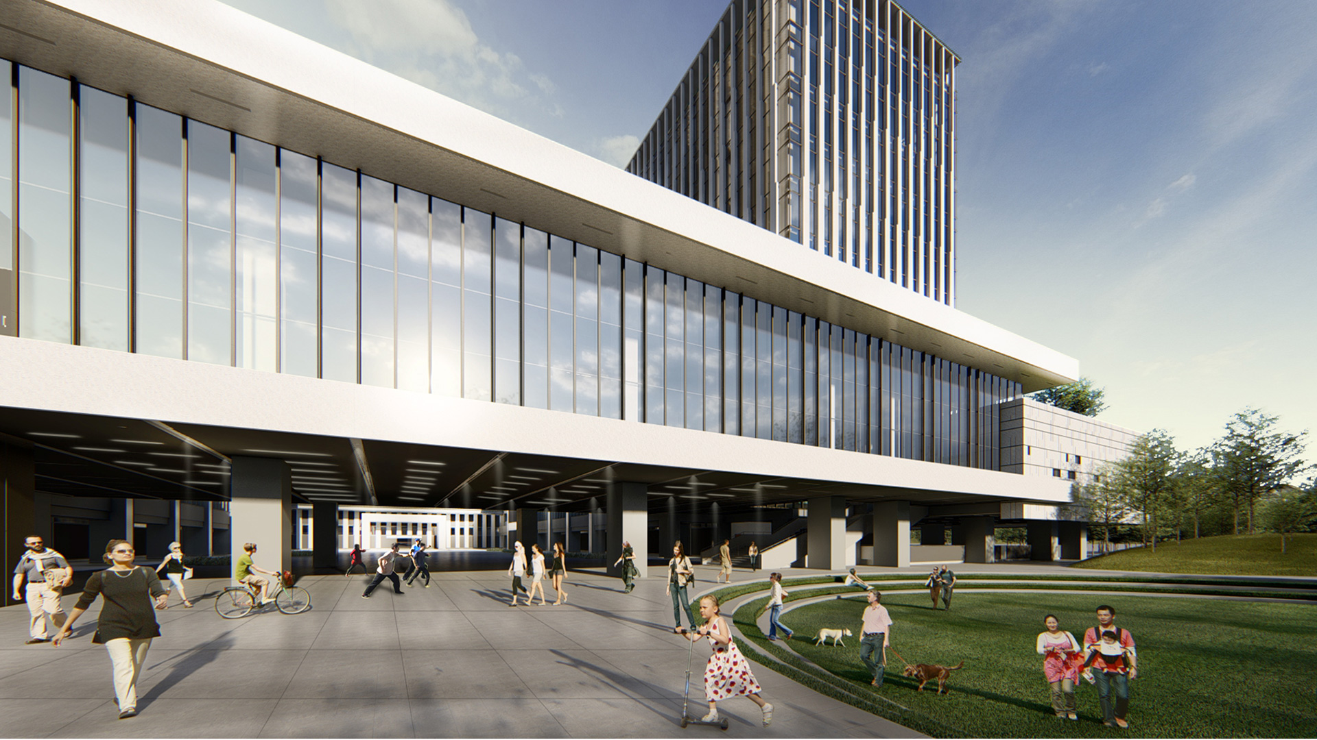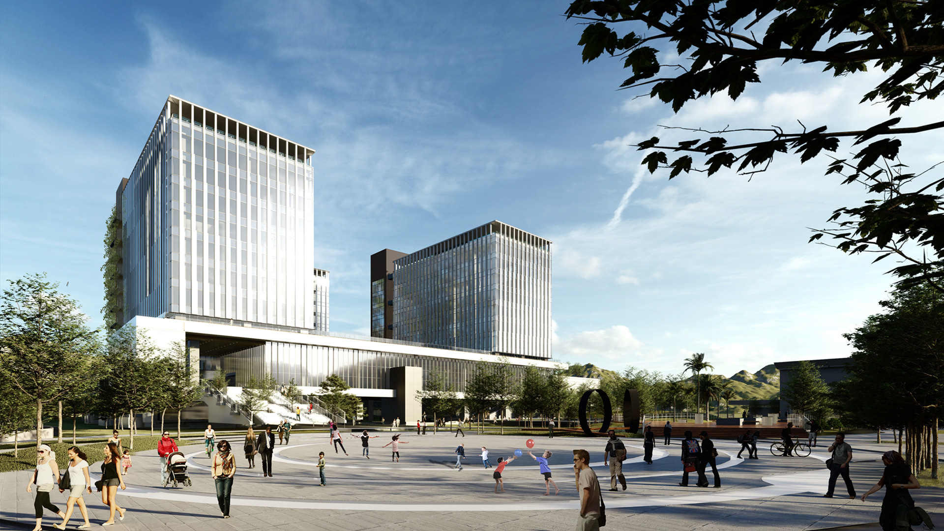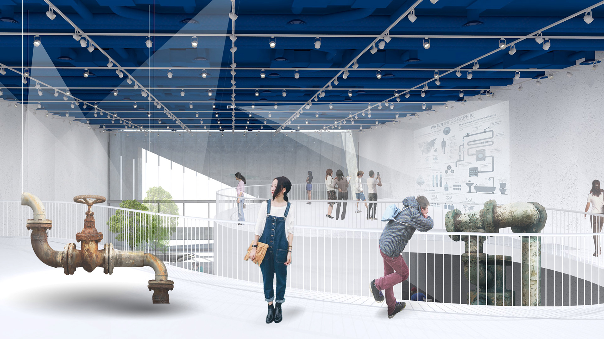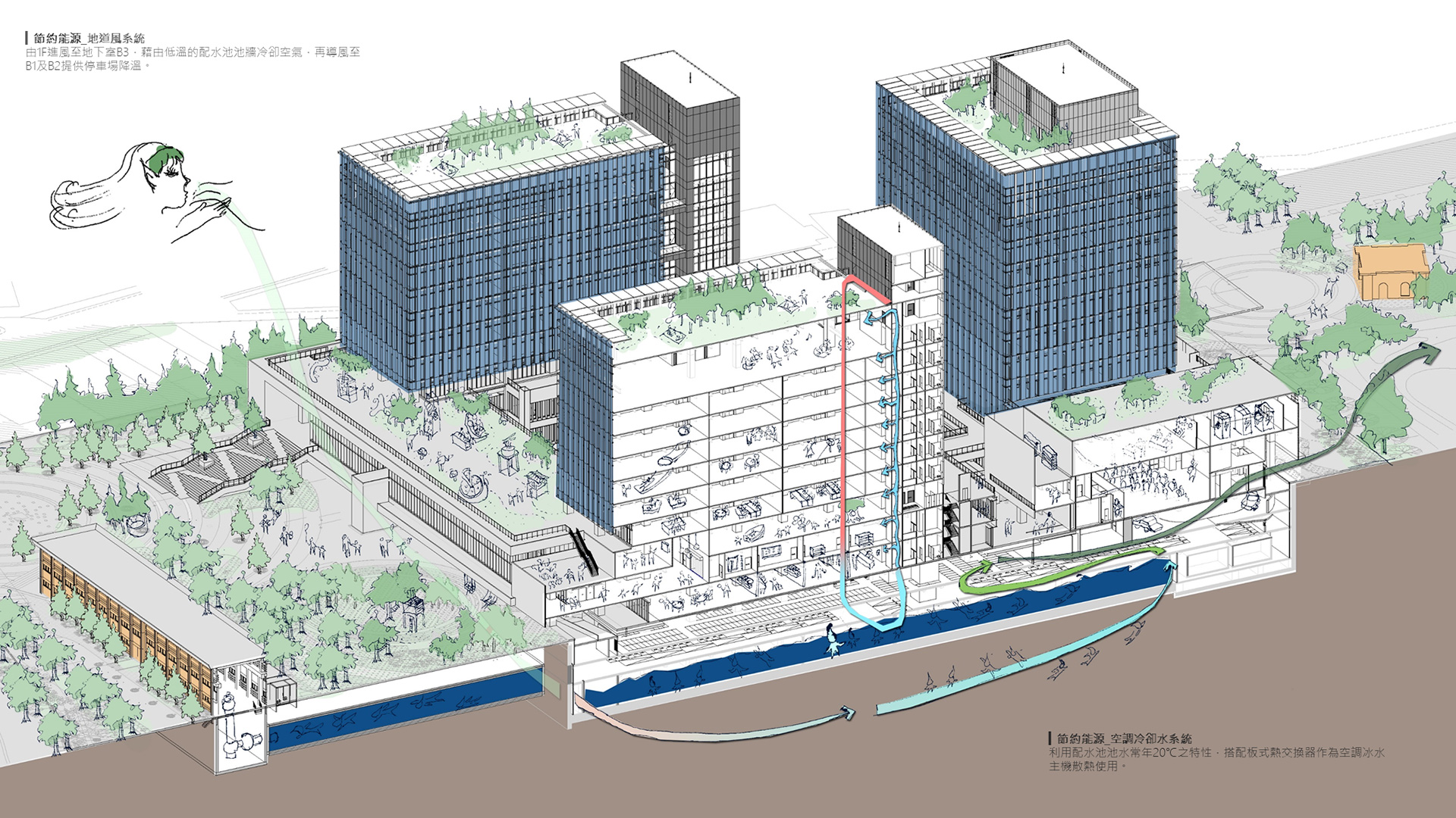 Energy-saving design This design is particular for its water distribution pool located on the third basement, with a total capacity of 470,000 tons of water and an annual water temperature of 20°C. This stable low-temperature water is used for air-conditioning cooling and cooling tunnel wind to introduce into the sultry parking lot space, this way it saves energy and adjusts the role of space comfort. In addition the smart energy system also includes the roof design with solar frame system and the façade and window washing equipment.