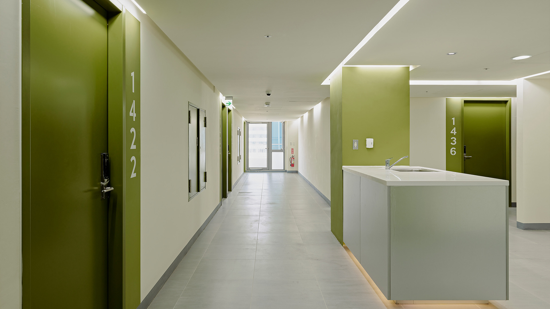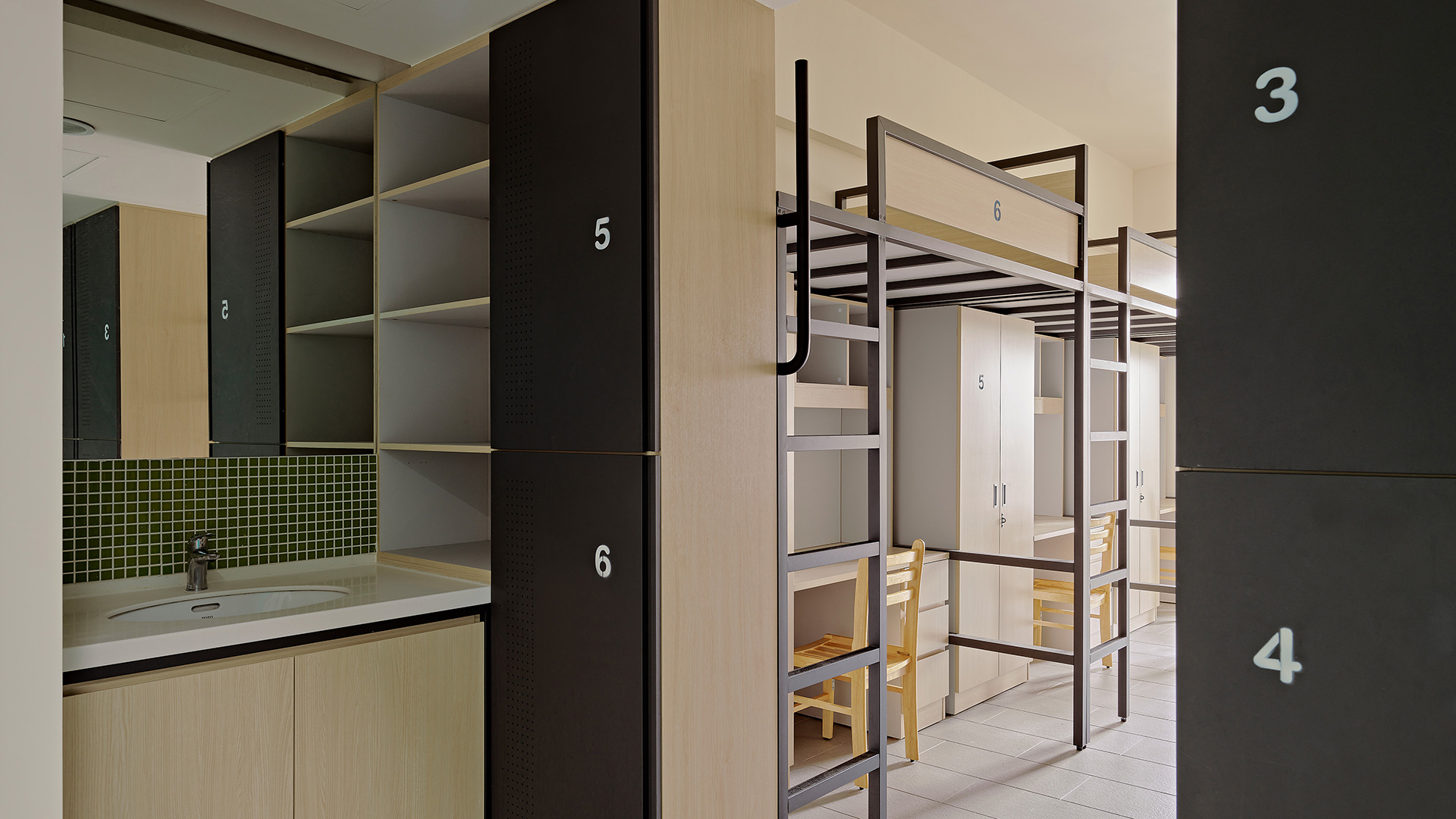 返回 台科大第一學生宿舍 11 年度 2016 - 2020 落成 臺北 業主 國立臺灣科技大學 基地面積 93,101 ㎡ 總樓地板面積 30,463 ㎡ 狀態 完工 類型 教育 / 住宅 本案舊校舍(第一學生宿舍)拆除重建之後可提供2,078床位,其中92%為一般學生宿舍,開放有意願的國內學生申請,並設無障礙寢室,以利身障或傷病學生使用。此外,為回應日益頻繁的國際學術交流活動,本案設置國際會館套房69間,為國際學人(訪問學者、國際學生及短期交換生等)提供方便舒適的短期住宿場所,呼應國際化應用研究性大學的本質。 校園綠地與開放空間系統綠意串聯 西北側以立面植生牆延續地面層植栽,創造人類與生態共生的可能性。藍色與綠色作為主體色調,延伸地面的綠意上至天空,象徵台灣科技大學的學生在此學習成長後向外翱翔於天地之間。 打開圍牆活化校園界面 融入周邊鄰里的好厝邊 回應住校學生及附近居民的對街道生活的訴求,重建工程將拆除圍牆,整合地面層成為連續、開放的公共(商業、服務)空間。增加高等教育、生活教育及社會教育延伸連繫之最佳平台,實現全人教育之理想。