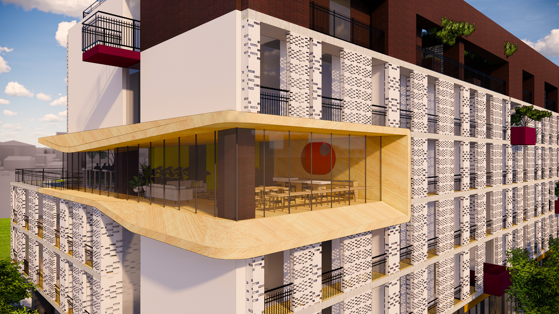 返回 台糖新都心循環宅 7 年度 2019 - 2024 落成 臺南 業主 台灣糖業公司 基地面積 2883.57 ㎡ 總樓地板面積 8247.64 ㎡ 狀態 完工 類型 住宅 以田園為意象的出租住宅 強化基地具有公園綠帶的特點,設計漸退式的公共露臺,一層層的將綠意往上帶,並依據尺度、需求性及優化建築物環的不同配置於住宅各處。 S尺度-各樓層釋放出的共享空間,小型社交空間、同時也為長廊導入舒適的通風採光; M尺度-公共空間與露臺合併設計,公共空間集中配置,並連接大露臺,為公共空間引進綠色地景及徐徐微風,屬久待休憩的園地; L尺度-屋頂露臺,為示範農園、可食地景是實踐循環經濟的院落; XL尺度-地面層廣場,是社區居民與都市民眾交流的城市場域,可與商店連接擴大使用性。 利用建築配置與開口計畫來達到降低能耗效果 建築物主要居室朝南北向,周圍並無高樓阻擋陽光,因南面日射量較多,設計上使用花格磚/金屬網減少立面之熱輻射。基地夏季以南風與東南風頻率較高,冬季以北風及東北風為主,露臺配置於南面,夏季迎向南風調節微氣候 循環社區 在基地尺度上,透過再生(綠色能源、可食地景、水資源回收)、循環(落葉堆肥、回收)、交換(可替換/拆卸材料)、分享(共享空間)、虛擬化(智慧建築系統)等實現循環經濟社區。 進入到單元尺度,透過預留(明管系統及預留設備空間、燈座)、租賃(模組化家具、衛浴)及陽台遮陽設計,實現節能、可持續性的循環住宅單元。 易於維護管理的可持續社區 設計上皆採用易於維管且循環的配置:動線部分,採用動線單一化、公共空間集中化、垃圾處理室臨路且採自然通風之設計;立面外觀採平整式設計,並透過遮陽格柵遮蔽機電外管線及室外空調機;梯廳採自然通風採光、走廊採用可拆式建材及明管設計;廁所浴室規劃於陽台側彩當層自然通風排氣;觀部分綠化使用盆栽式設計,避免漏水疑慮。