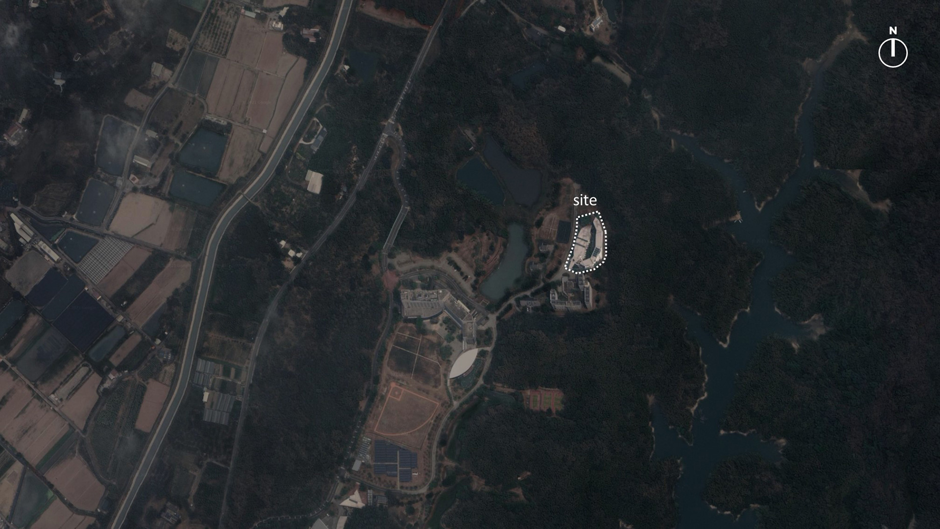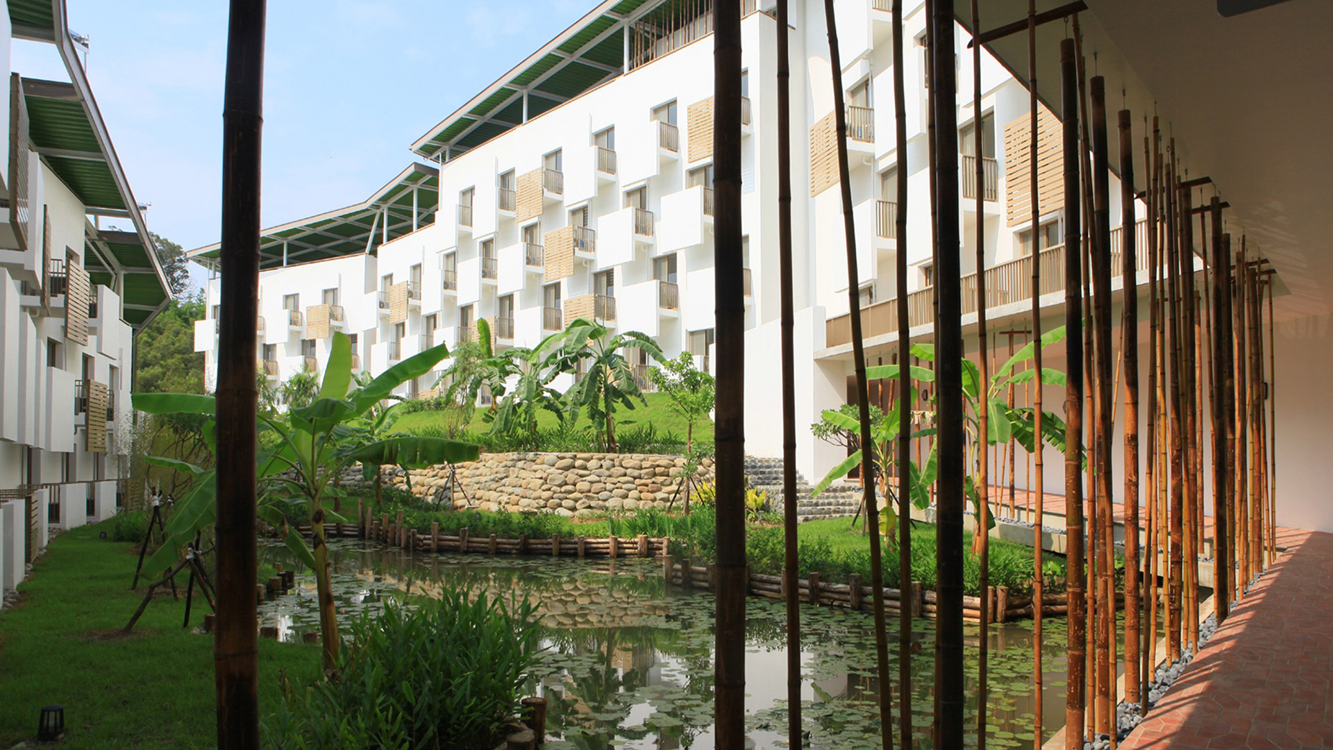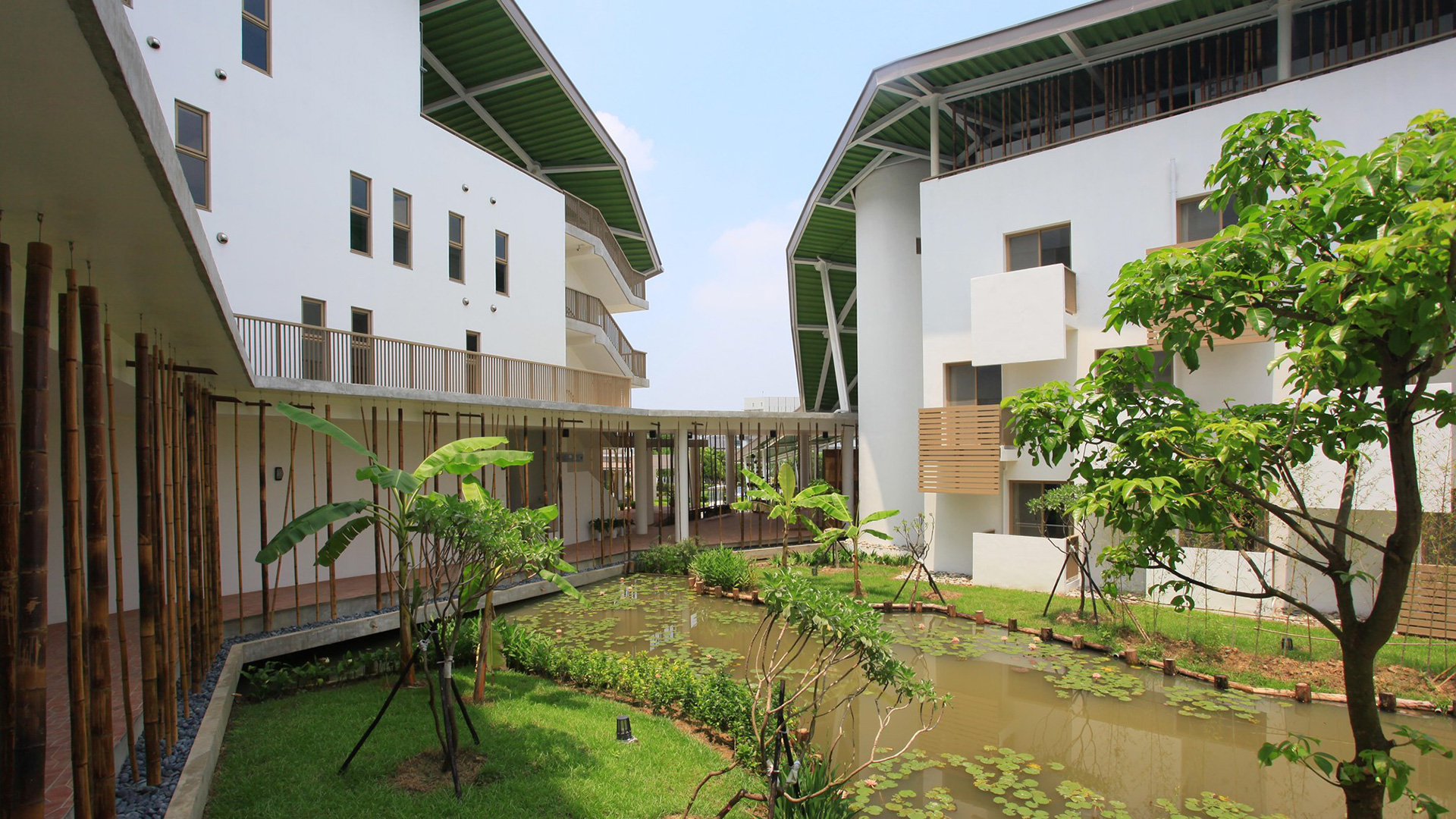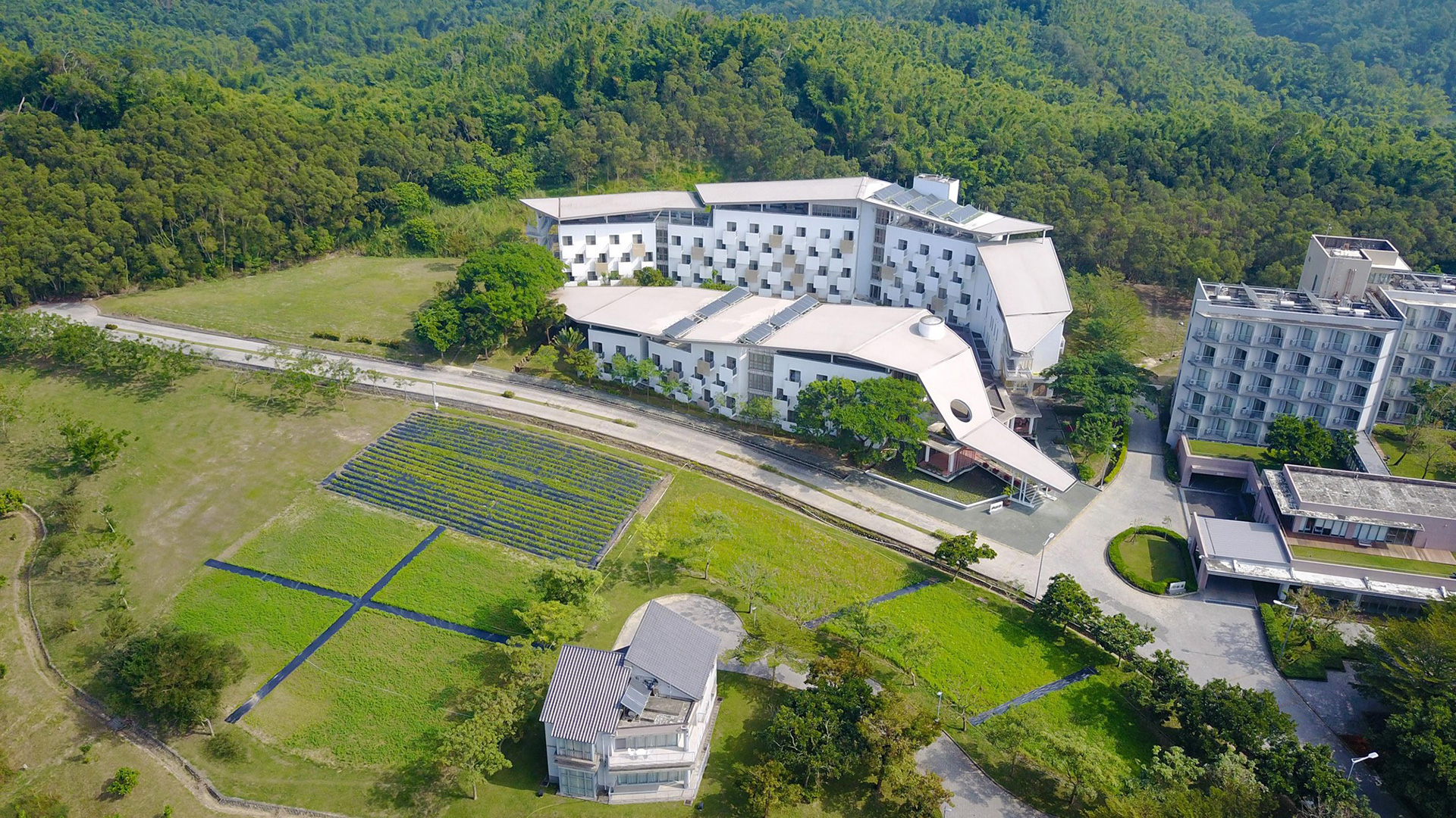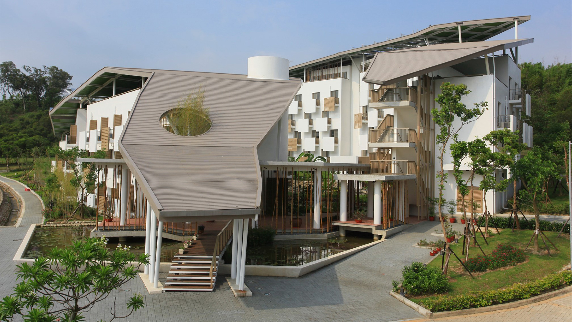 北部夏天用“熱”形容,南部夏天則用“燙”形容。基地朝西俯瞰嘉南平原,平原就是壯麗的夕陽和雲彩的舞台,超過五個月的“燙”夏天和朝西的正面是整個設計課題的核心。我們用南台灣民眾最常用的“雙層屋頂”(鐵厝),和高科技、低價格的「反射漆」,加上水的蒸散作用,來解決這個問題,雙層屋頂間就是觀賞夕陽的觀眾席。至於冬天,南台灣的冬天本來就是地球上最舒適的地方之一,洗個太陽能集熱器送來的熱水澡,愛地球愛得很踏實。入口大廳整個泡在水裡,被莎草、睡蓮、野薑花和香蕉、龍眼、光臘、柳樹包圍,蜂、蝶、蜂、鳥也漸漸入住。為台灣產業技術打拼了一整天的年輕人,回宿舍時,走過大廳、長廊,穿梭在水影和綠意之間,轉換溫度也轉換了心情,人住在這裡不感受到大自然生命的燦爛也難,唯一的問題是要學習在蛙鳴的陪伴下入睡。