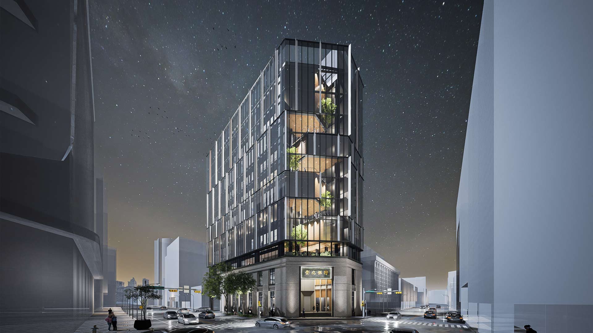 返回 彰化銀行桃園分行 9 年度 2024 落成 桃園 業主 彰化商業銀行股份有限公司 基地面積 1,164.00 ㎡ 總樓地板面積 1,2062.94 ㎡ 狀態 設計中 類型 辦公 歷史與未來的交會 位於桃園火車站旁的彰化銀行桃園分行,宛如一枚歲月的印記,靜立於繁華商業的心臟地帶。自承載了57年城市記憶以來,這座建築即將迎來全新的蛻變。隨著時代更迭,分行將暫別舊址,而未來的新大樓將以智慧科技與現代設計為核心,成為提升商業活力與客戶體驗的金融新地標,為城市注入嶄新的生命力。周邊環繞的是不斷更新的商業活動與蓬勃的都市計劃,開放空間賦予這片土地更豐富的當代意涵。設計靈感由此而生,探索歷史與未來的對話,連結過往的城市記憶與現代繁華,織就新舊交融的都市紋理,為城市塑造溫暖且創新的篇章。 桃園門鑰:守護與啟迪的象徵 彰化銀行自1905年創立以來,見證並參與了台灣的每一重要時刻。新大樓設計受銀行金庫、歷史與服務理念的啟發,以「孔明鎖」為意象,象徵財產保護、文化傳承與金融創新。新建築將成為守護桃園的「明日之門」,引領台灣金融業邁向充滿希望的未來。設計以創新、在地、企業形象與永續發展為核心,這些要素相互交織,既支持品牌創新,又融入當地特色,在過往與未來間創造出獨特的張力。新建築彰顯彰化銀行「社會共好、誠信經營、永續創新」的經營理念,並以LOGO與立面造型的結合,以及品牌形象與空間設計的連結兩大方向進行設計轉化。 街角新貌:多維空間與歷史語彙的共生 延續設計理念與計劃需求,建築主體在基地條件框架下精準配置,融合歷史記憶與開放空間。量體設計契合周邊城市肌理,臨街面延續既有語彙,保留原有建築部分立面元素,並創造退縮的開放街景空間,讓商業氛圍與多維陽台視角得以豐富呈現。這座建築不僅是對現代與歷史的敬意,更是一種嶄新的城市空間詮釋,承載著對過往的致敬與對未來的展望。