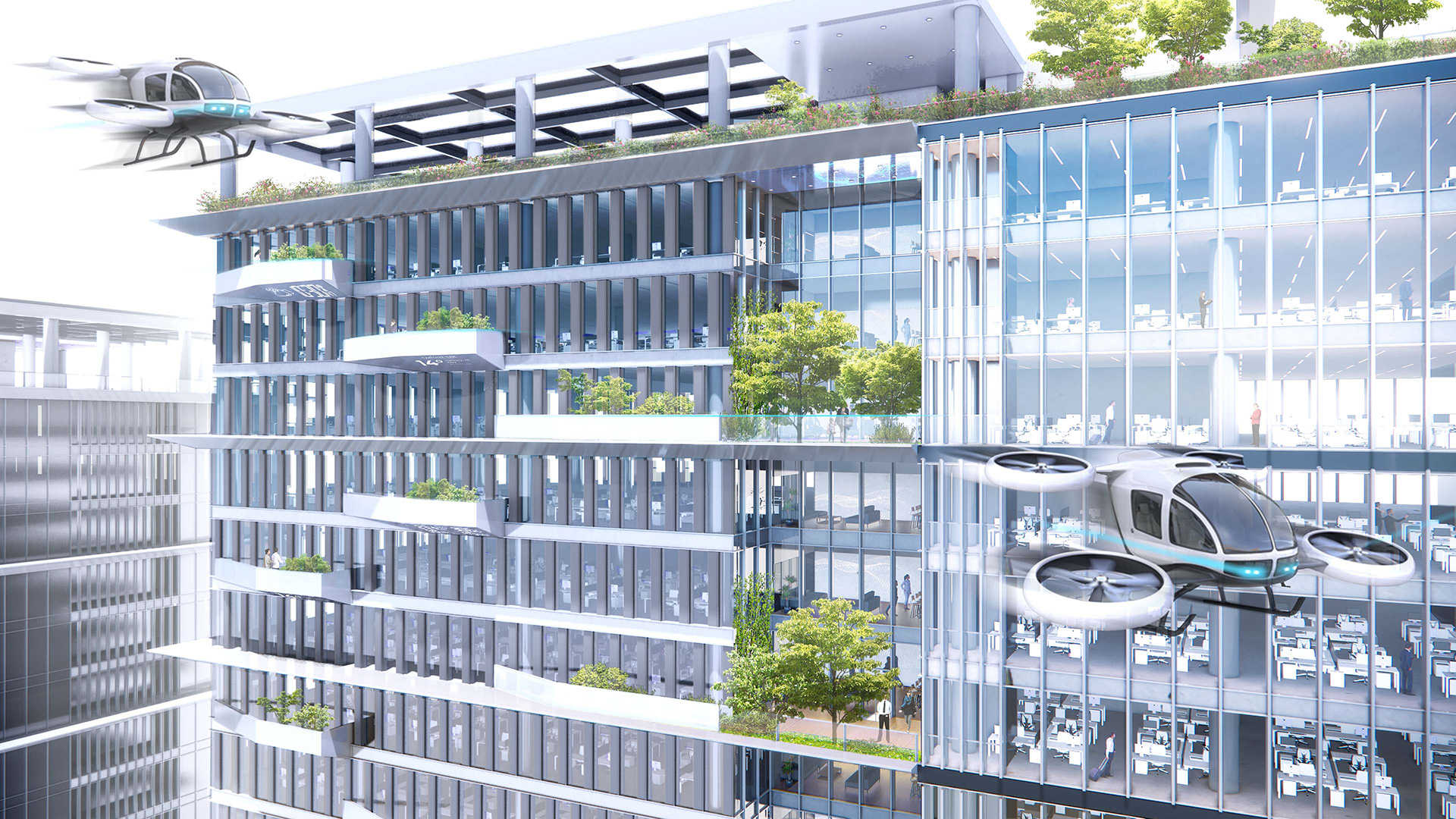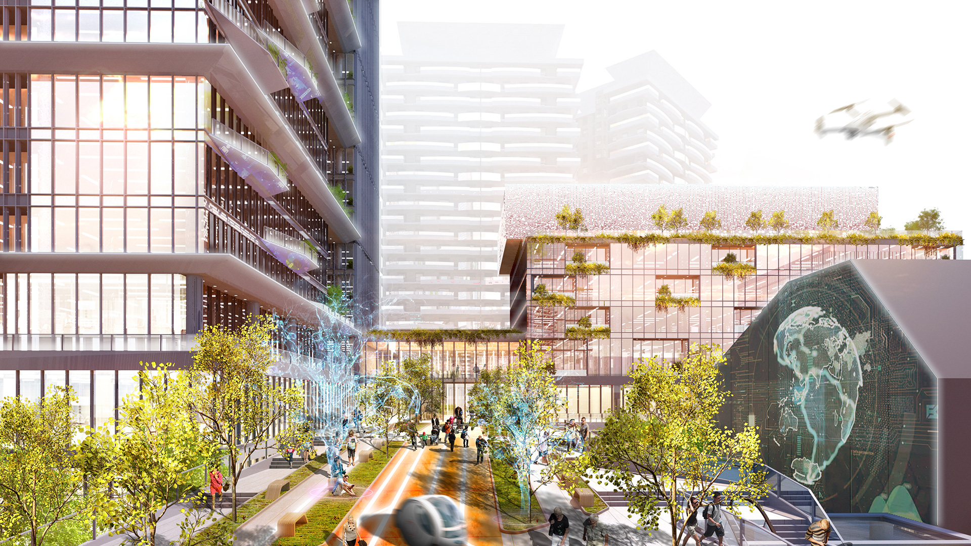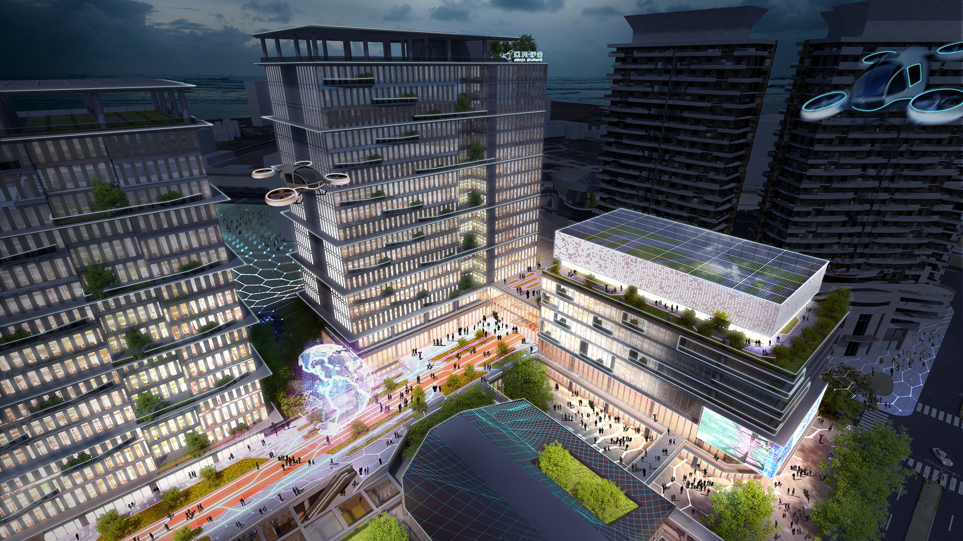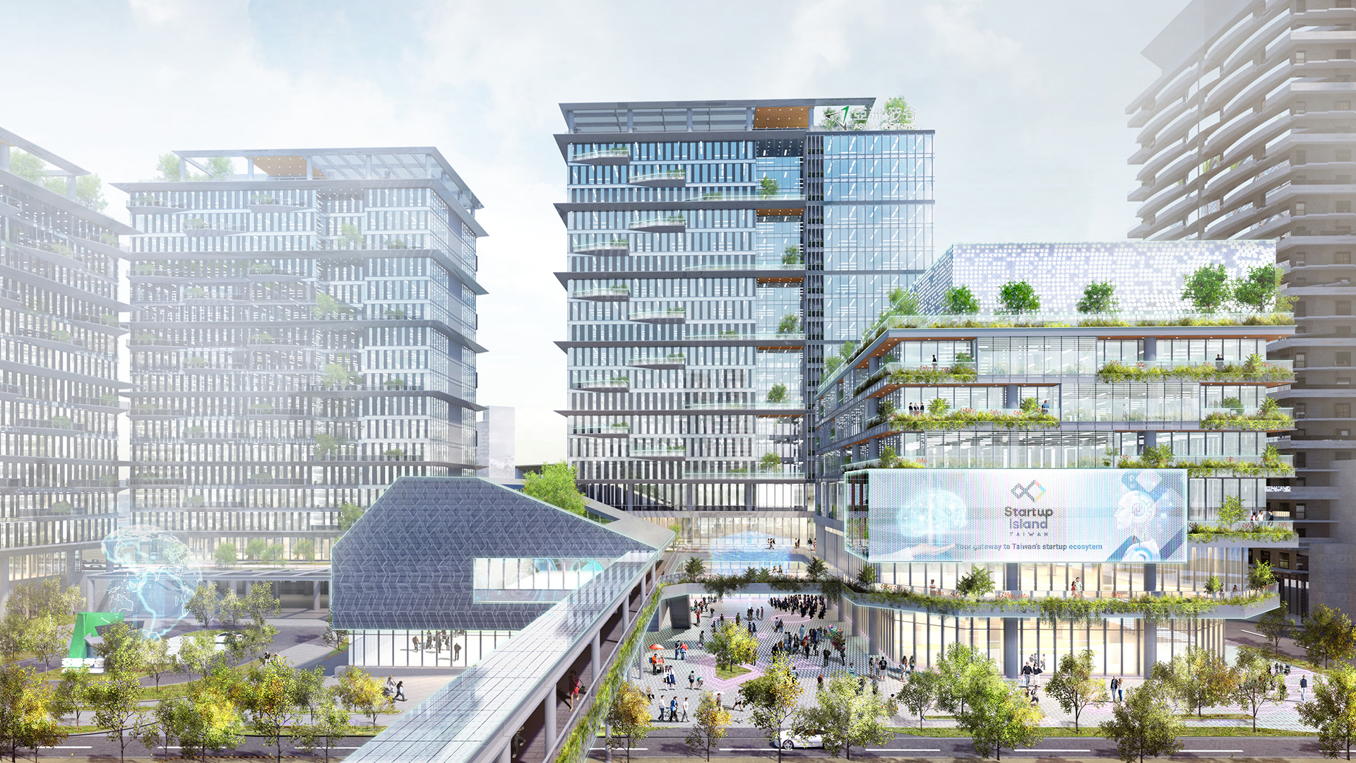 園區第一期建築包含服務中心棟及研發中心棟,服務中心棟含有綜合商場、城市願景展覽館、青年新創中心為服務大眾活動產業中心,其頂樓的大數據中心與城市能源管理中心為整個智慧園區的大腦;研發中心棟將開放對外招租期許更多國際人才來此優質環境工作並交流,希望科技在此起飛人才夢想成真,讓這個創新研發中心能有不一樣的未來。