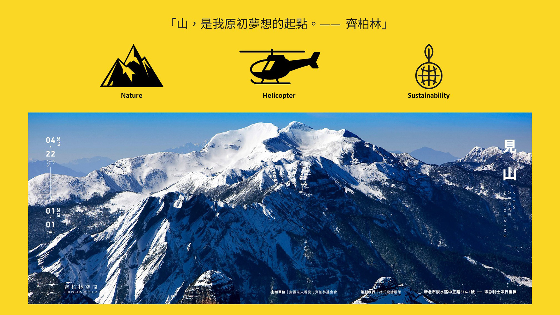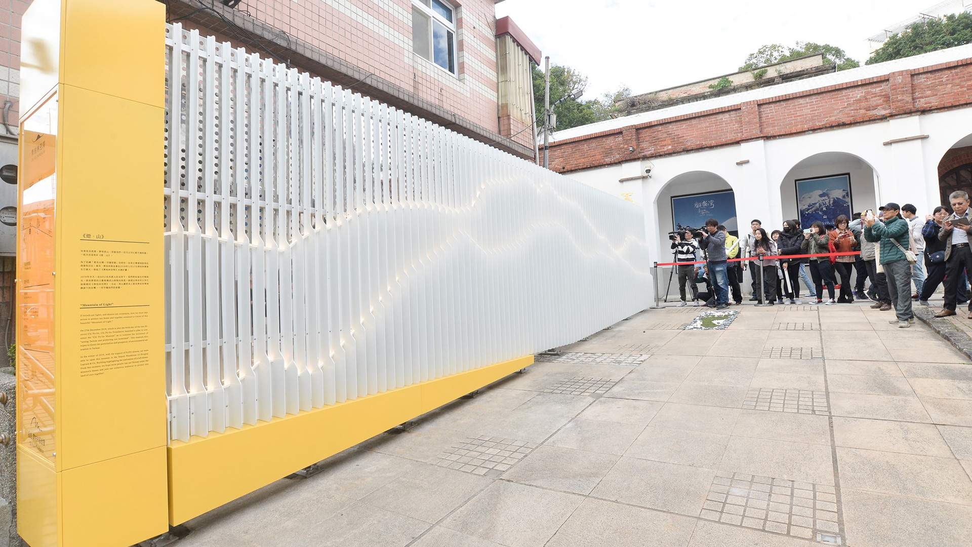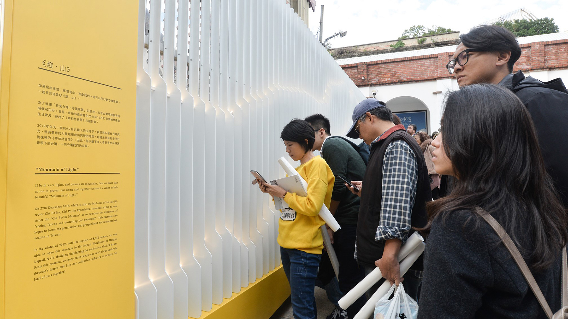 這座牆代表著”眾人的力量”,是匯集了許多人的善心與力量而成的。本牆以山岳為啟發,山覆蓋著台灣這座島嶼70% 的土地,並象徵著強健與崇高的精神。本牆以90支白色鋁板排列出台灣與東亞的第二高峰,海拔3886公尺的雪山的輪廓。我們希望以這種形式表達出眾人的團結正在保護著台灣的環境。鋁質的板材呼應著齊柏林導演所搭乘的直升機的材質;同時捐贈者的名字也以一行行形似雨滴或雪片的形式呈現在上面。