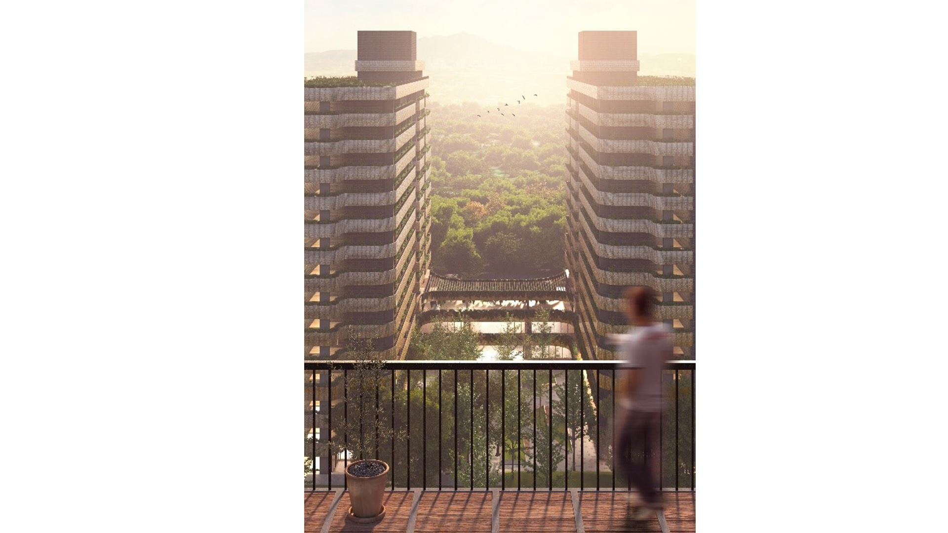 建築設計及都市策略採以利己利鄰作法,社宅東西兩棟平行排列,留出 25m 寬景觀廊道,使東西兩側保留最大視野,同時北側 臨近康莊社區亦可共享南邊極佳的關渡平原美景。配置順應常年風向,打造涼爽通風環境。