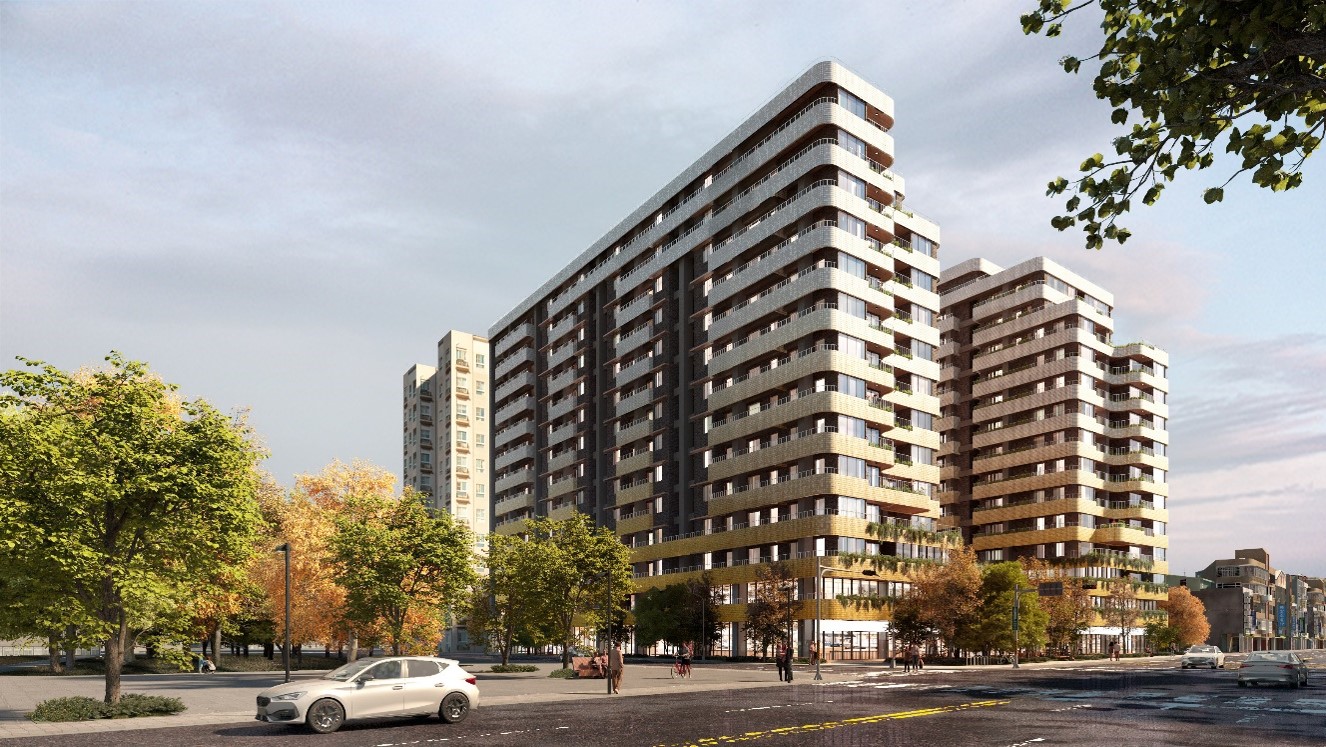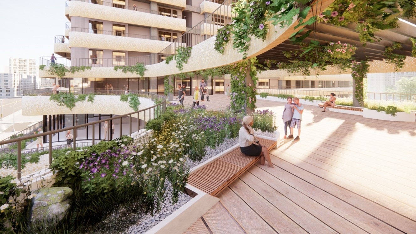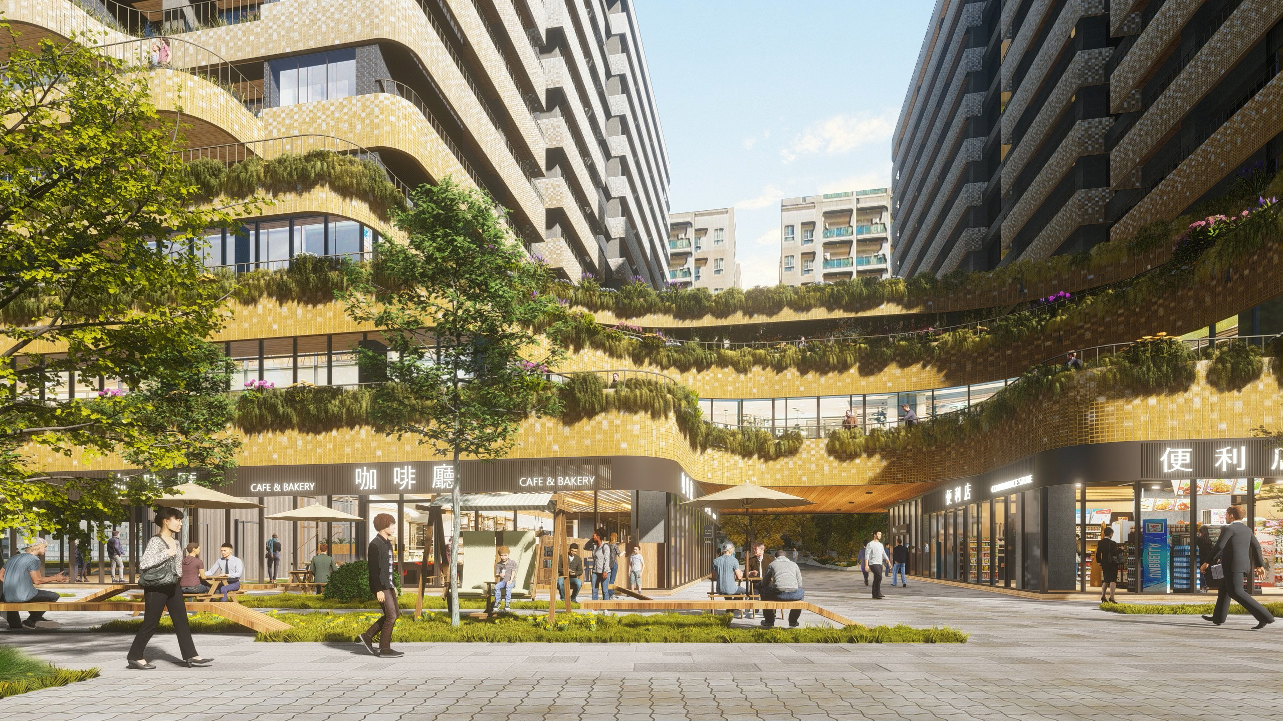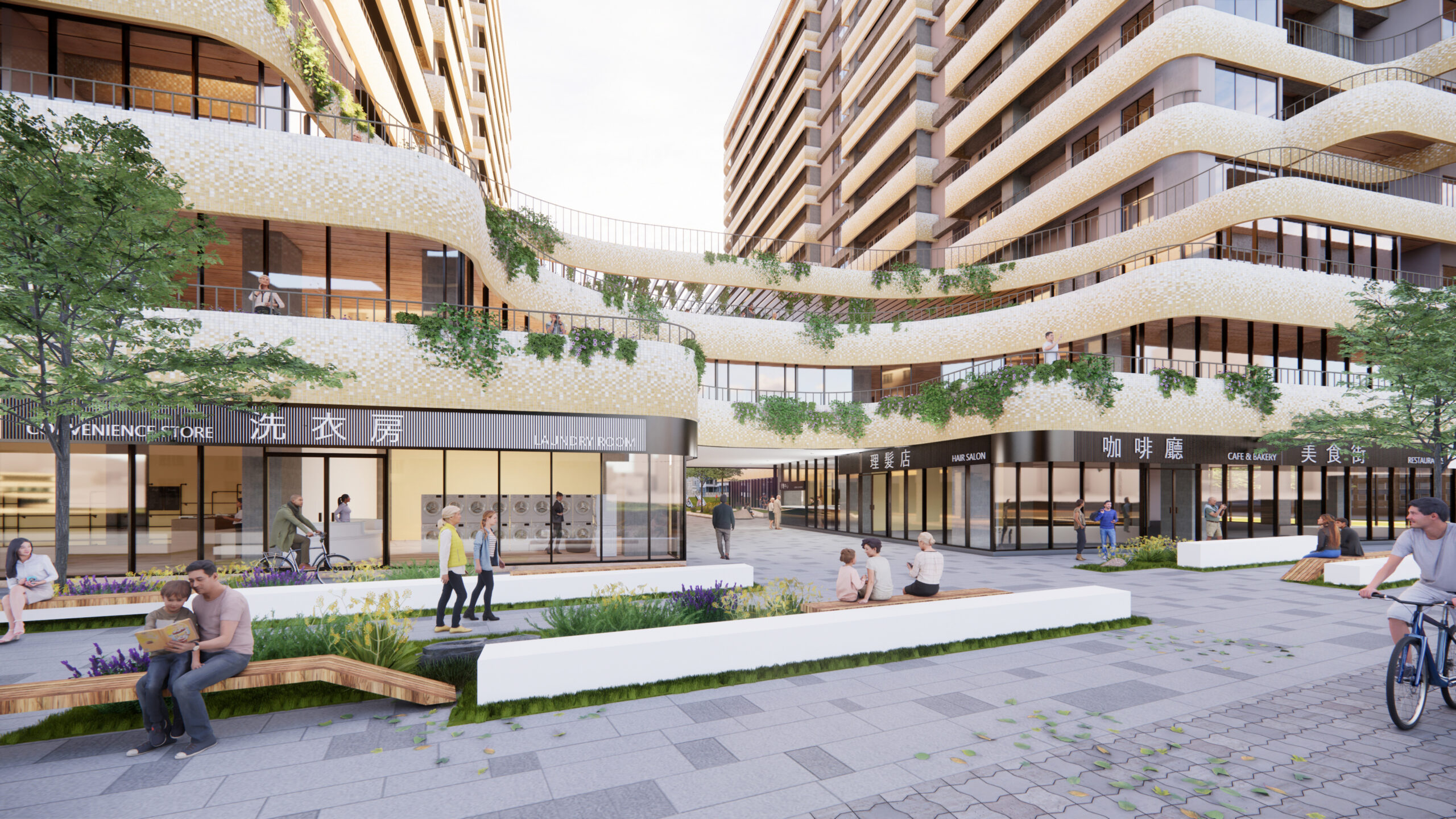 社區 1 樓為商用空間,西側設置托嬰中心補充周圍鄰里不足的公共設施機能,提供未來入住居民友善的托育環境。 2 樓南側為出租辦公室,北側開始設置住宅單元。 3 樓南側設計綠色景觀露台及住戶共享空間,提供住戶交流、活動場所,活絡社區凝聚力。 2 、 3 樓北側至 14 樓為住戶單元的使用空間,共可容納 472 戶居民。