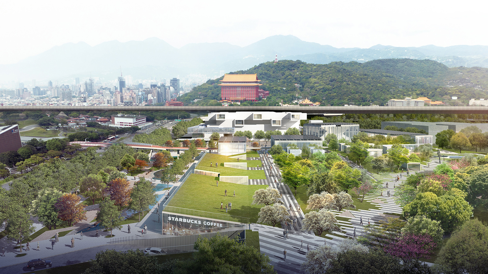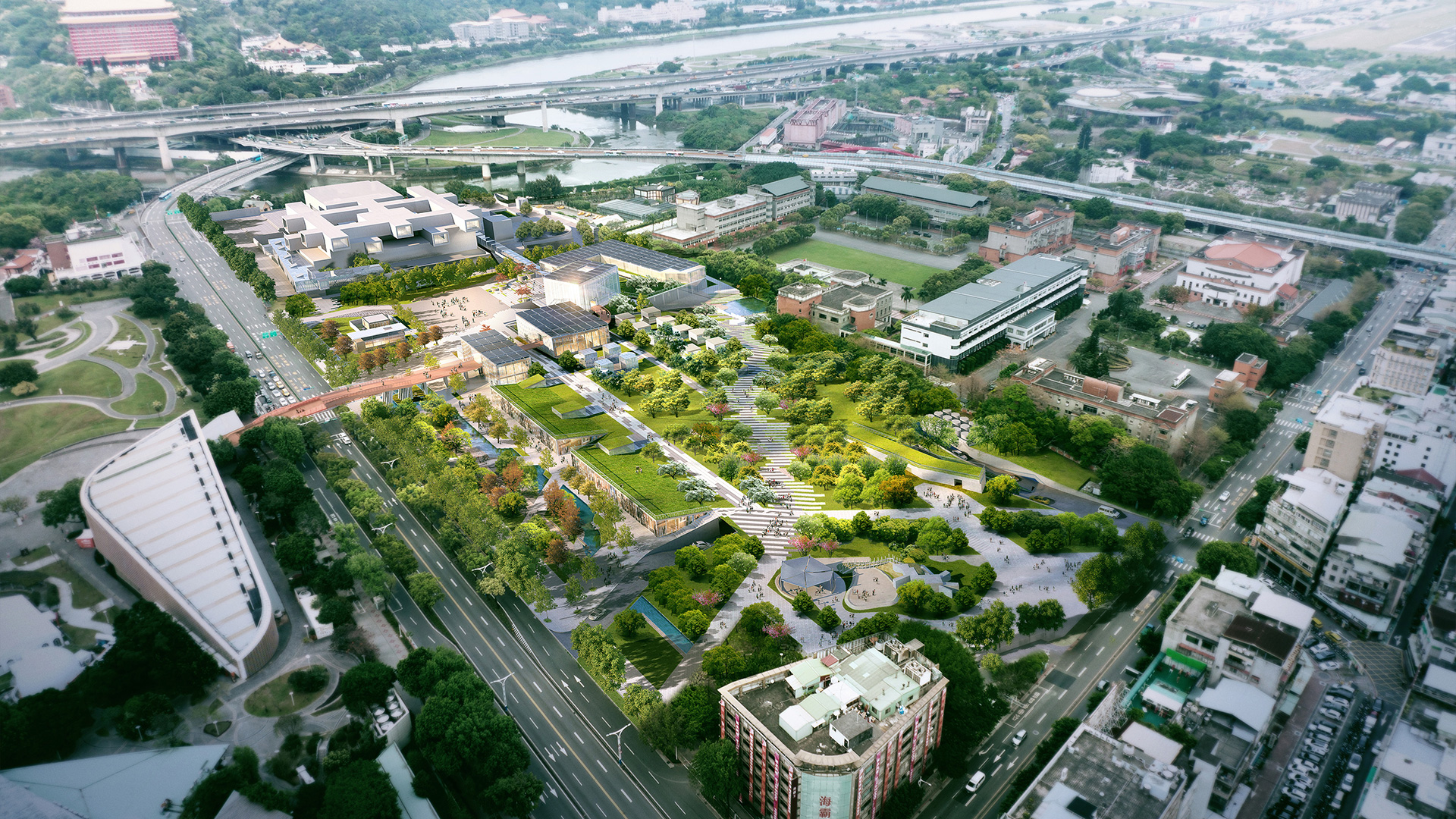 本設計規劃出台北美術館園區,將美術館角色擴及到整體都市層面。透過天橋Airwalk系統將圓山捷運站與新舊美術館建築串聯整合,向北延伸至本館、向東延伸花博新生公園,把鄰近的幾個公園都串連起來,人們不經意間走入園區,便能與美術館相遇。我們以「森林公園下的前衛美術館」為定位,將園區依劍潭山軸線分成兩區,靠中山北路側是「人的活動區」,東側則是「生態區」,讓自然美感永續恣意流露。