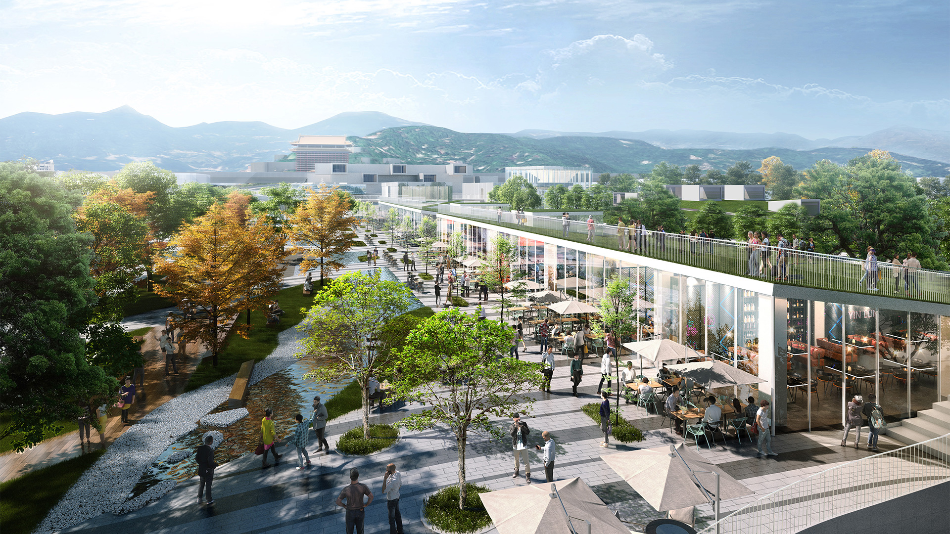 沿中山北路側帶狀商用空間,可各自展現多樣風格,為重要活化街道生活與延續中山北路都市活力的關鍵。建築退縮讓出綠地,使用空間可進一步擴展至戶外景觀區;翹起向東傾斜的覆土綠屋頂,將中山北路的喧囂與車流,跟公園生態區隔絕開來。館內商業空間具備獨立之後場、卸貨動線,成為具美術館特色之書店、商店,可獨立對外營運。