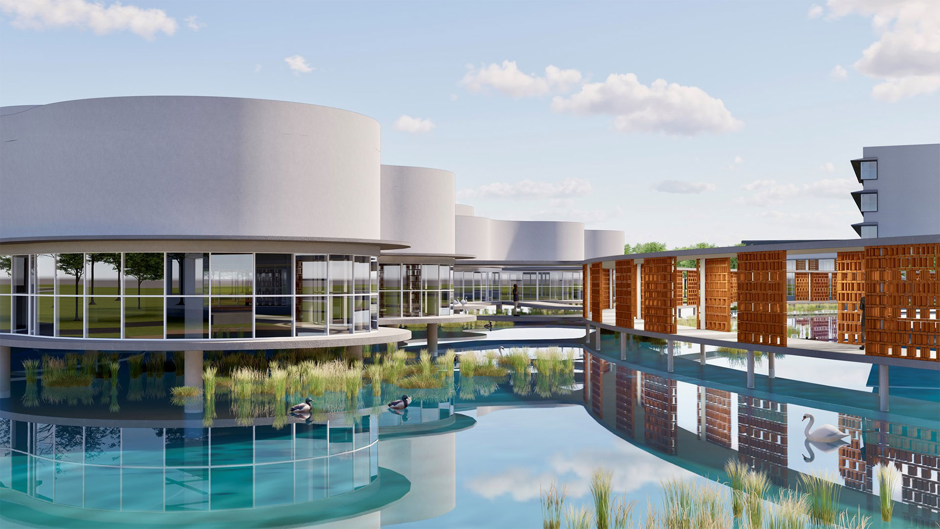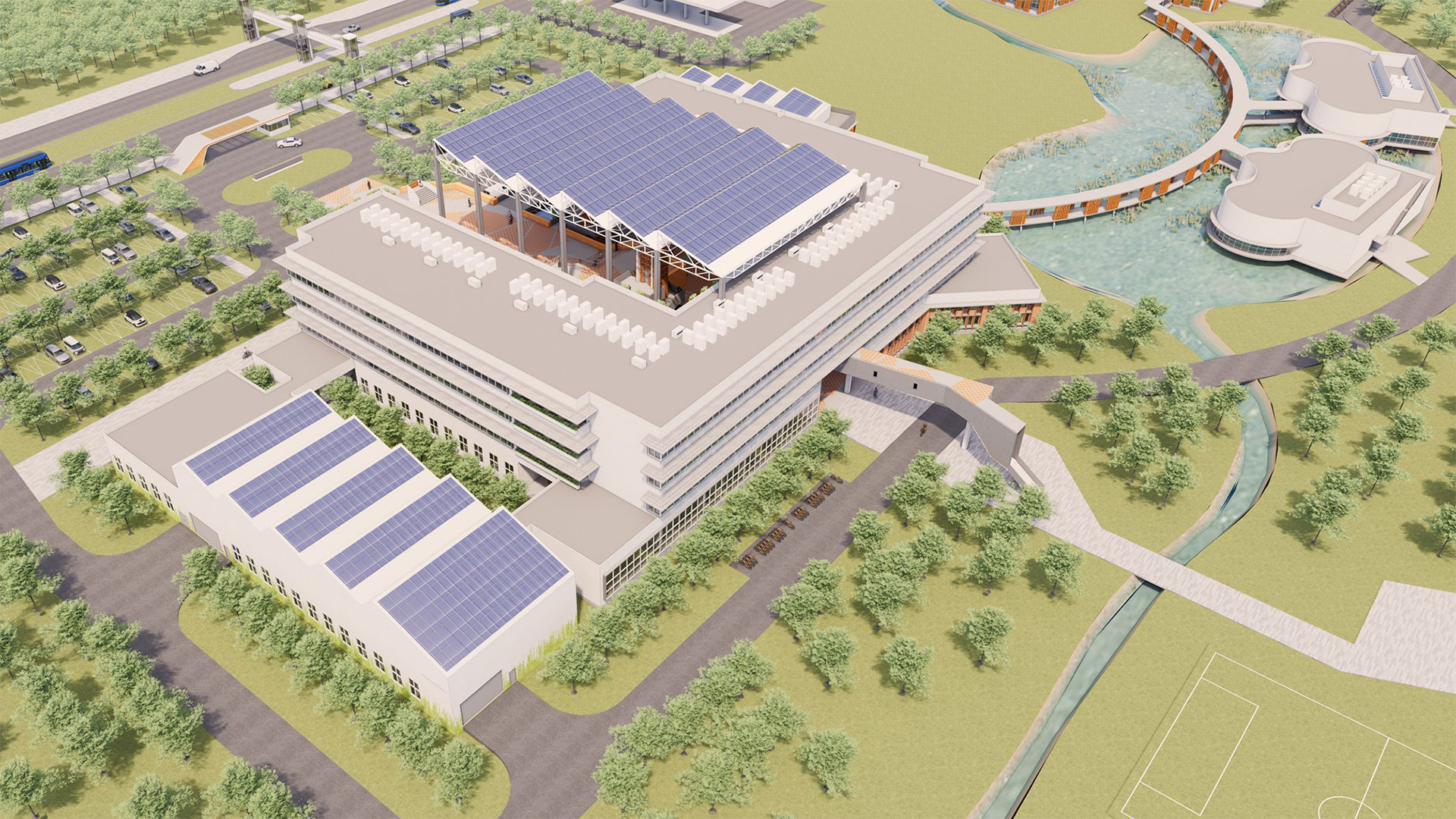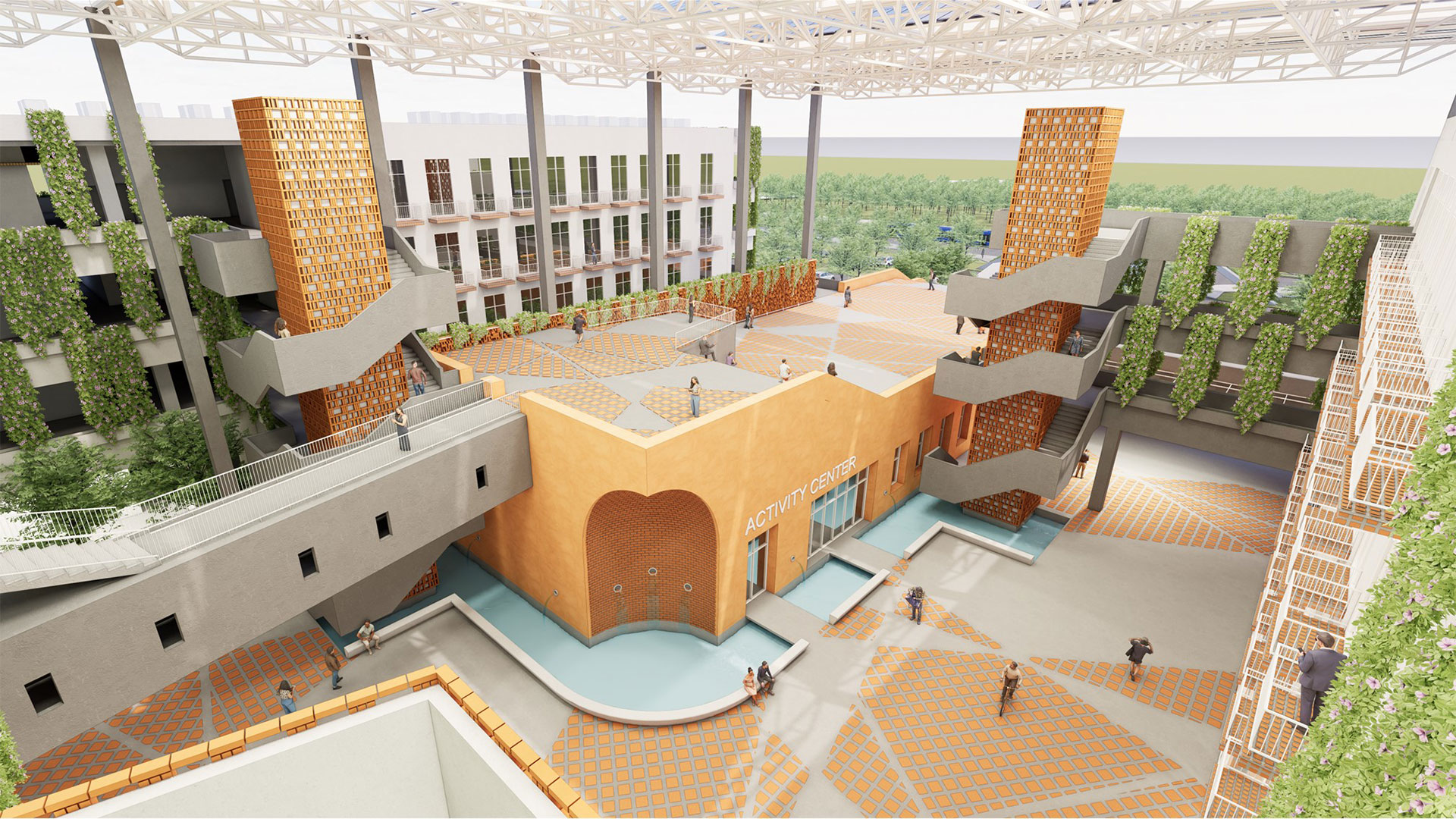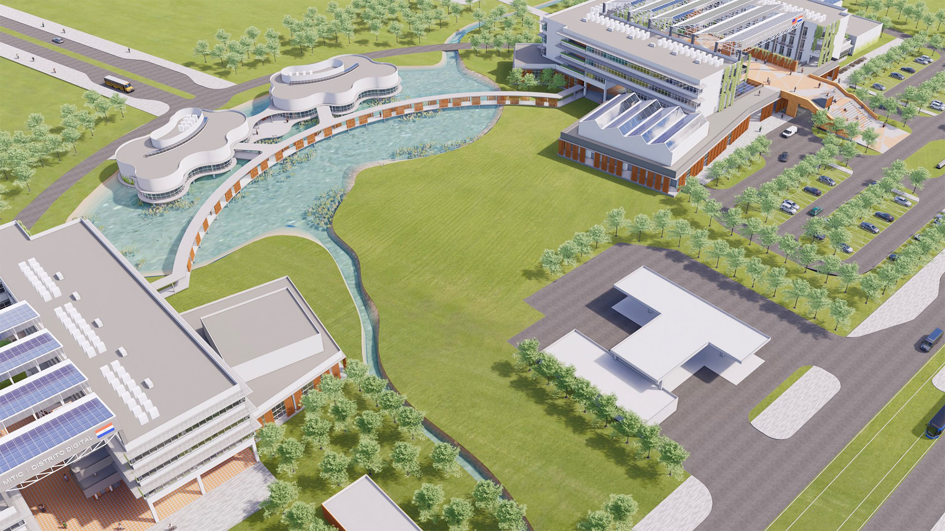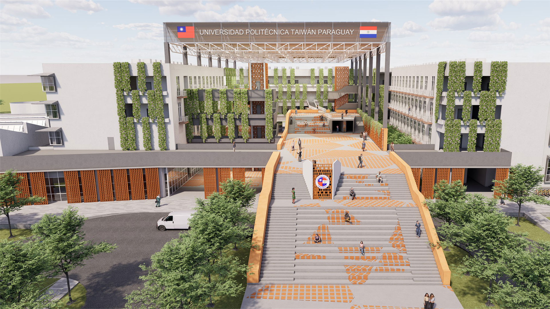 返回 臺灣巴拉圭科技大學校園規劃案 7 年度 2024 落成 巴拉圭 業主 中華民國駐巴拉圭大使館 基地面積 163,615 ㎡ 總樓地板面積 19,090 ㎡ 狀態 設計中 類型 精選 / 教育 本校園規劃案位於西爾維奧·佩蒂羅西國際機場西側,距機場約 1.6 公里,佔地 16.36 公頃。由於鄰近機場,場地設有 20 米的建築高度限制。南側為繁忙的高速公路,可能對場地造成噪音影響。東側則緊鄰阿羅約·伊塔伊河,並且場地內有一條水道貫穿,形成自然的水資源條件。此地點的氣候特徵使得設計有利於自然通風與陽光的引入。 校園規劃分為兩大區域:東側 10 公頃規劃為UPTP校園使用區域,西側 6 公頃則為 MITIC 和數位園區。首期建設包括 UPTP 入口廣場、戶外停車場、學術建築、學生餐廳、五人制足球場及與數位園區相連的風雨走廊。數位園區內設有共享入口、MITIC 辦公大樓、數位園區大樓,並且包含與校園共享的生態池畔餐廳和開放式廣場。 永續設計 屋頂和廣場設置太陽能板,並為空調設備與管道系統預留空間。設計注重與自然環境的融合,綠化走廊和庭院不僅美化空間,更提升了校園的舒適度。 文化融合 建築外立面運用了巴拉圭傳統磚牆元素,與現代的玻璃幕牆和混凝土結合,既保留了地方文化特色,又符合現代設計需求。未來發展上,校園北側預留可擴展區域,並計劃設置二層廣場延伸的管狀結構連接,未來可直接連接至校園北側區域,確保校園在未來的成長中之可持續發展。