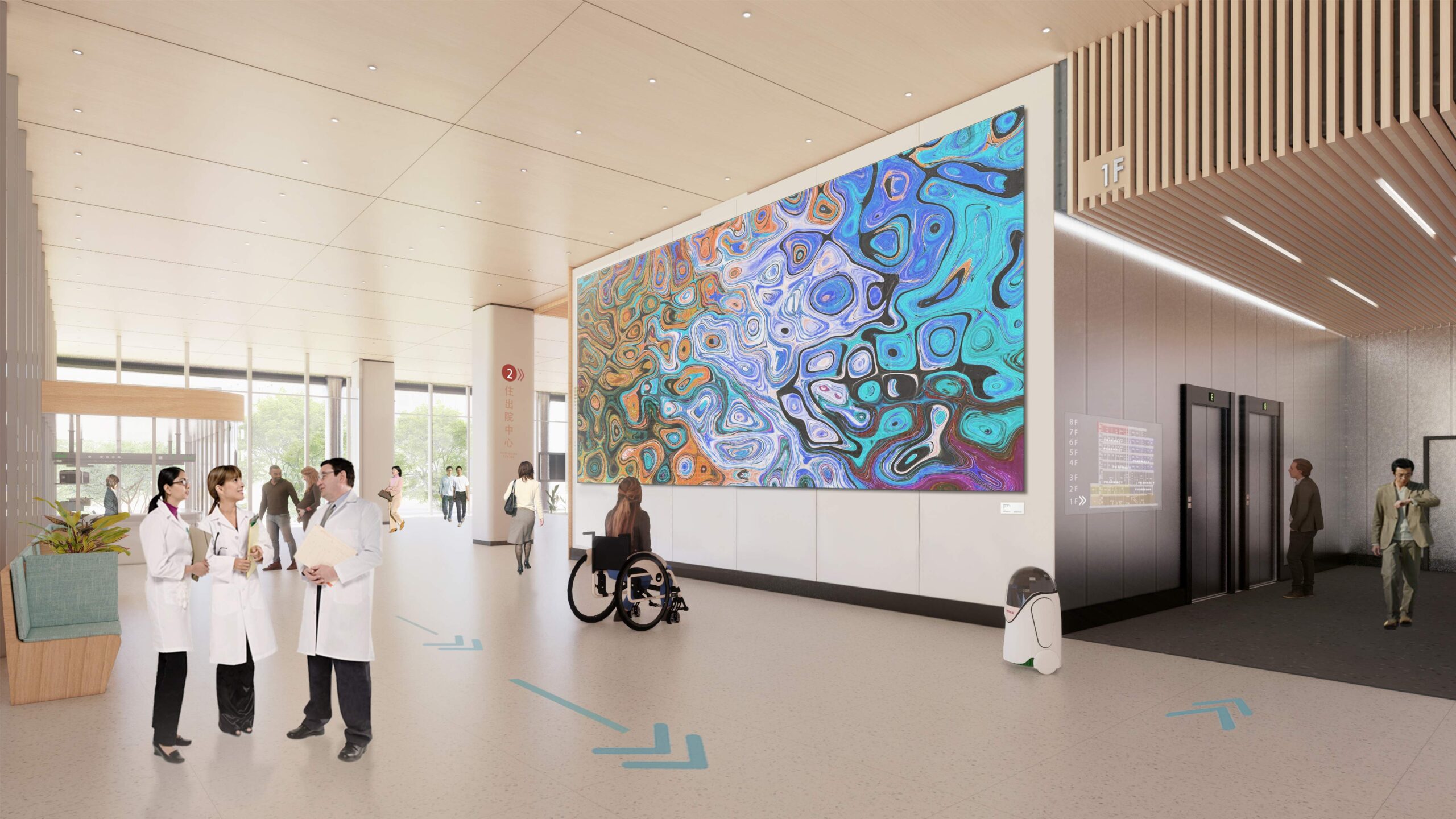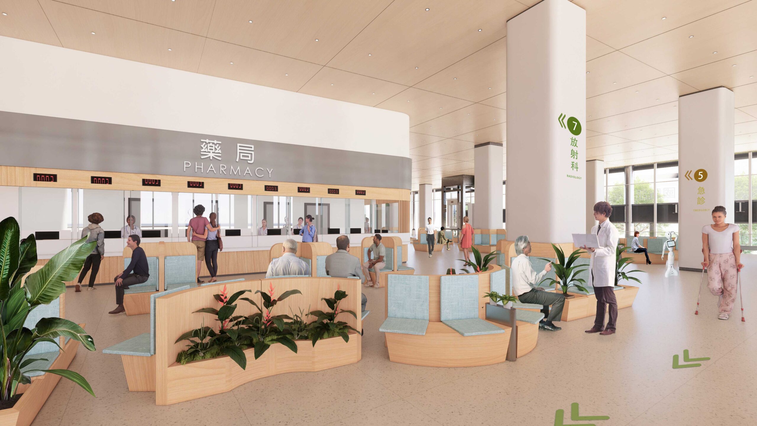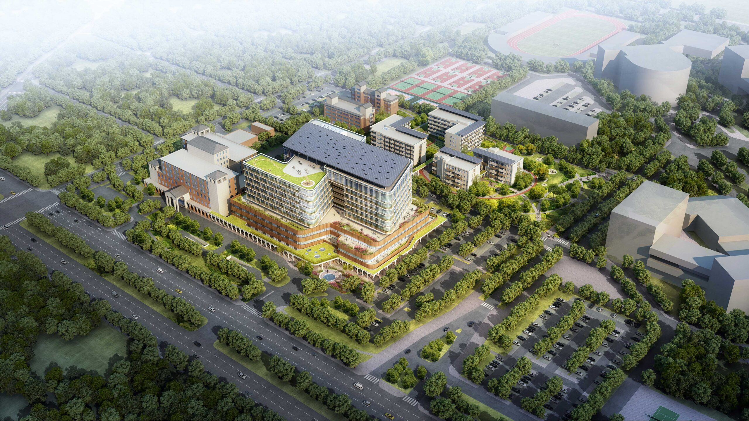 返回 虎尾醫院醫療大樓綜合大樓 (競圖) 6 年度 2023 落成 雲林 業主 國立台灣大學附設醫院雲林分院 基地面積 67,660 ㎡ 總樓地板面積 156,434 ㎡ 狀態 競圖 類型 醫療 / 競圖 智慧醫療、人本照護、永續環境 本案透過完善的空間規劃與系統整合,打造兼具功能性、韌性與人文關懷的現代化醫療園區。整體配置共分為三大主體建築:醫療大樓、綜合大樓(含污水處理廠)與醫護宿舍。醫療大樓為本案核心,集中設置門診、急診、影像、檢查、手術與各式病房,採水平分層與垂直分流設計,清楚區分病人、醫護、訪客與物流動線,有效提升流通效率與感染管控能力。特別針對疫情後需求,規劃有獨立的感染動線與緊急隔離路線,確保醫院在特殊情況下能迅速轉換為應變中心。綜合大樓設置於院區後方,結合行政、公共服務空間與污水處理設施,並與醫療大樓透過空橋連接,形成後勤支援的中樞。建築採節能外殼與高效通風設計,確保能源使用效益與舒適性,並考量與現有院區與周邊街廓的協調性。醫護宿舍則獨立於醫療區外圍,提供約五層樓之居住空間,以「安居樂業」為設計出發點,兼顧私密性與社交互動,並設有共享廚房、休憩陽台與綠意中庭,提升醫護人員的生活品質。