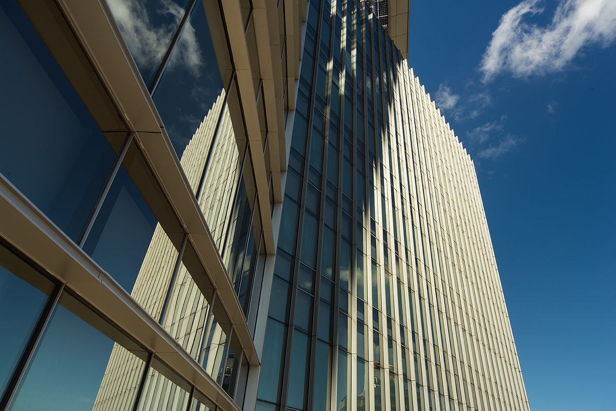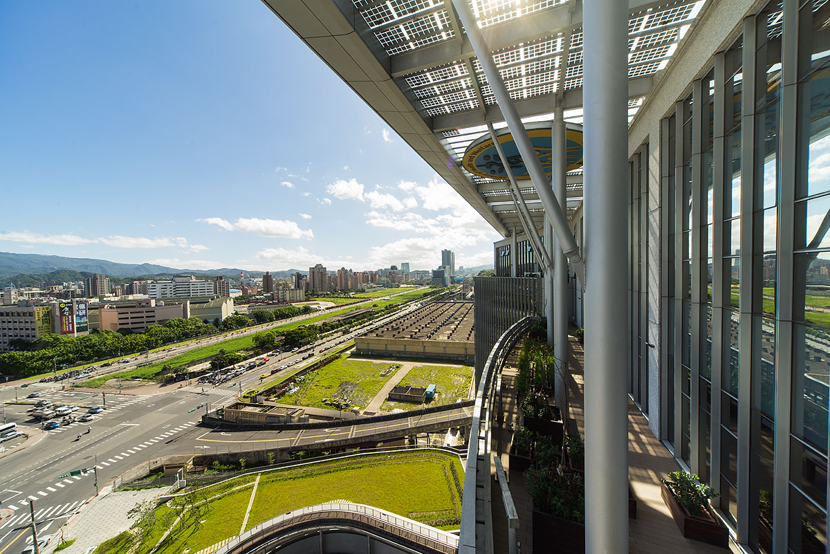 基地保留最大的綠地面積,同時開放給社區民眾使用,主要入口退縮六6米創造綠色廊道使用透水鋪面亦降低了地表輻射熱,提升戶外的舒適度,綠廊並與後方的自然景觀串連,綠地土坡、植栽與退縮亦作為緩衝空間以降低道路及東側高架橋所帶來的噪音干擾。配合雙翼環繞的中庭與屋頂休憩花園,將多層次的綠意延伸至室內;北面大面落地帷幕引進充足光線,室內自然採光減少照明使用;以智慧化感測器提供室內空氣品質監測與空調系統連動自動提供換氣及調控功能,直接外氣引入,配合外氣空調箱引入外氣以減低空調耗能,節能效率約可達15.8%,創造出低汙染、高效率的舒適工作環境。