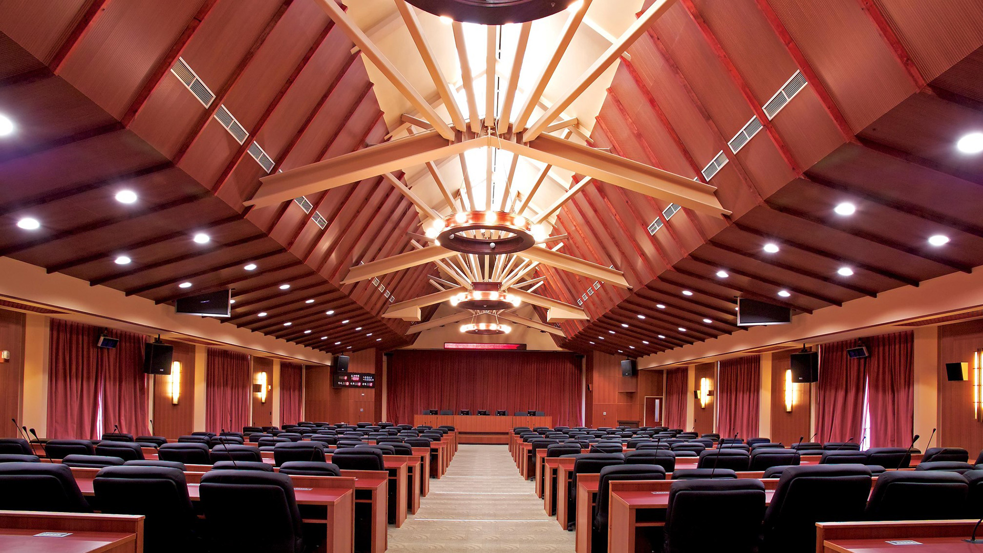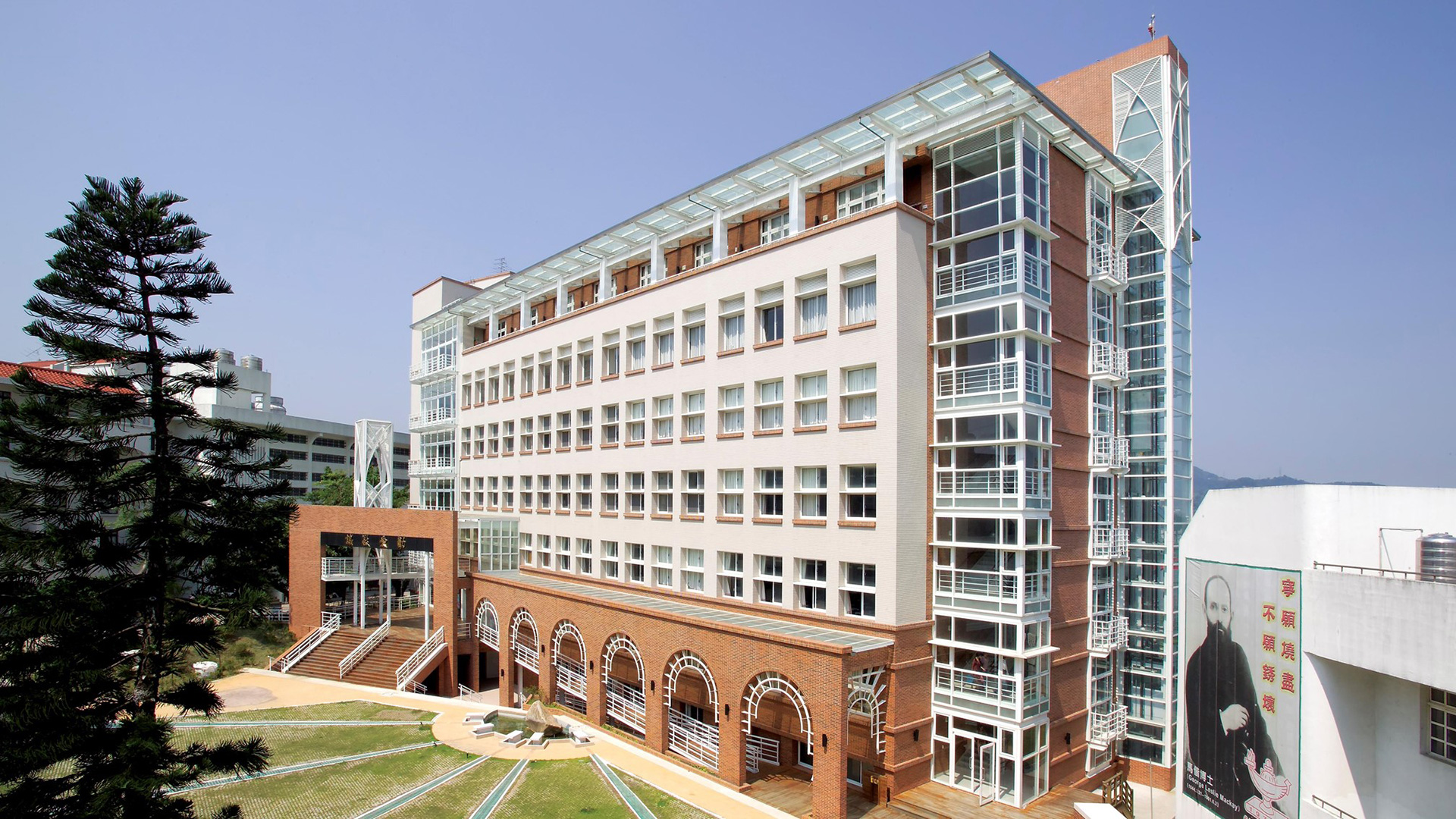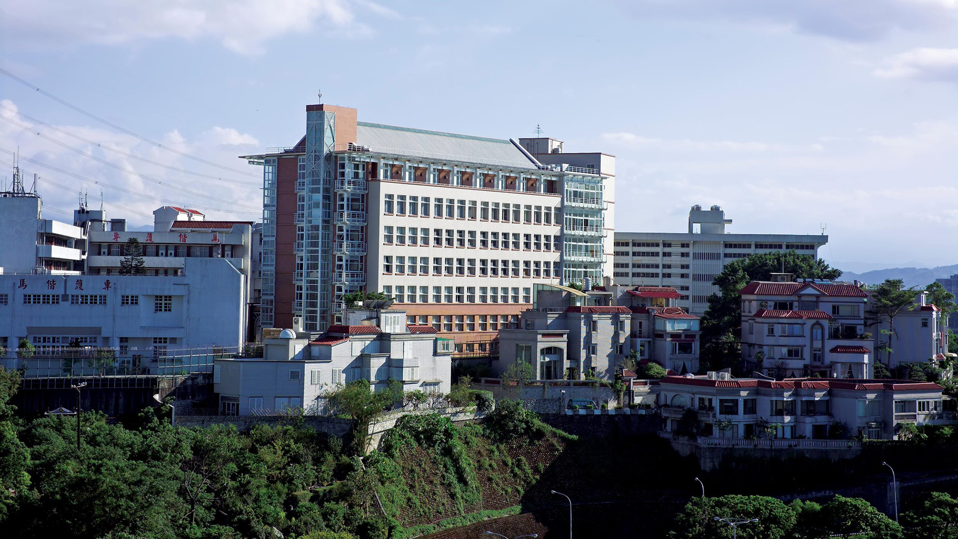 六、七樓層為行政人員辦公空間及會議室,尤其七樓運用斜屋頂挑高的優勢,利用設計手法變化出層次豐富、莊嚴中不失活潑的空間,也在屋頂彩鋼上適度地留下採光天窗,增加自然採光的可能及對省能的一份堅持。我們對於建築外牆材料的考量,採馬偕原有的白色風格,並為協調山下別墅區所配置的低層裙樓紅色二丁掛磚,位於山頂之新建案所對天際線的不利,也因顏色的降低削弱了量體的龐大,造就整體都市觀感融合。