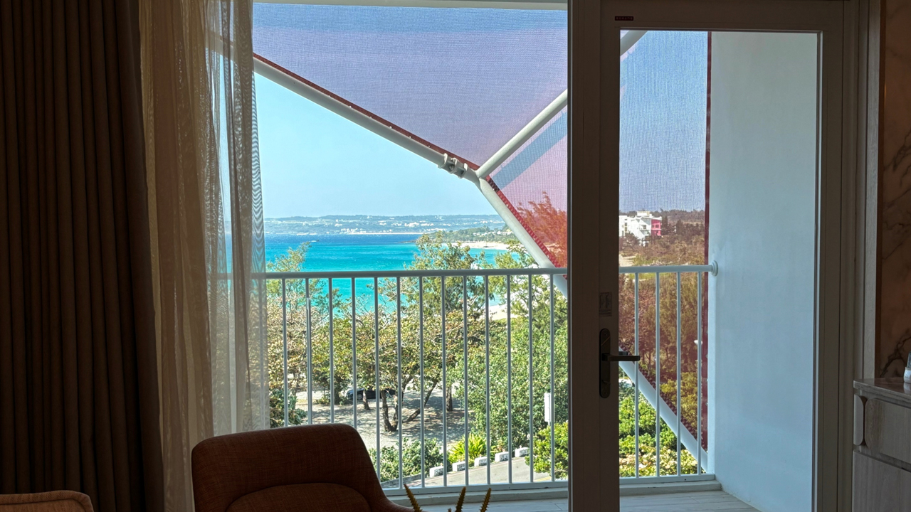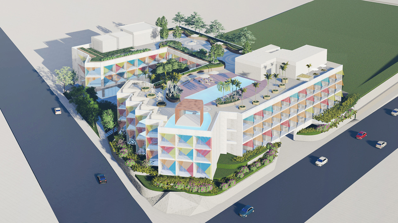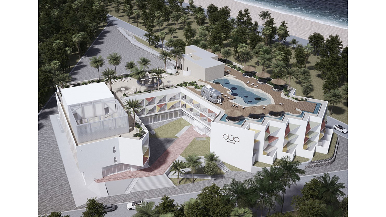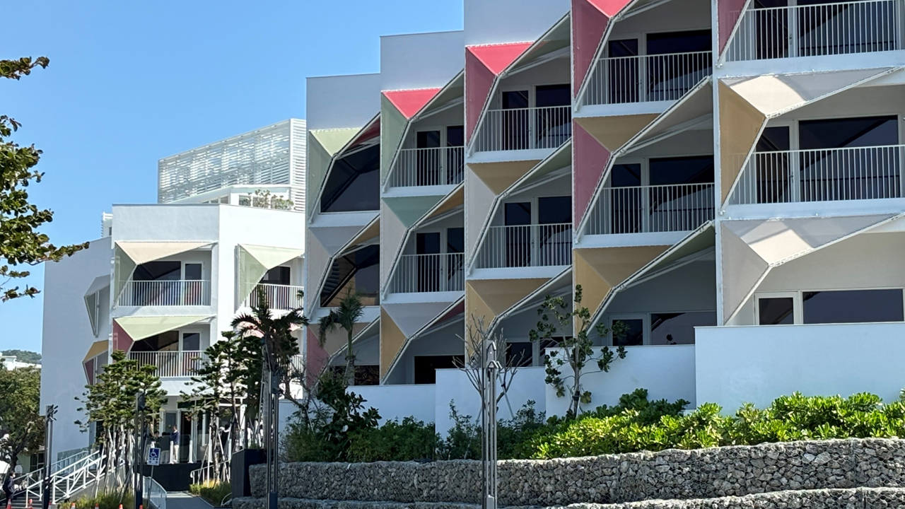 基地保留現有小葉南洋杉、木棉花、鳳凰花;中庭榕樹保留與植栽為調節微氣候降溫,防風林保留則可阻擋落山風與噪音、降低會館環境溫度。建築物外牆保留墾丁特有、由基地內開挖之咕咾石,以箱型石籠方式再利用於入口牆面與景觀圍牆。陽台遮棚系統採用模矩化法拉利布,並融入珊瑚礁的繽紛色彩展現熱帶海洋意象;游泳池下方的接待大廳挑空,引入自然光線與海洋色調。